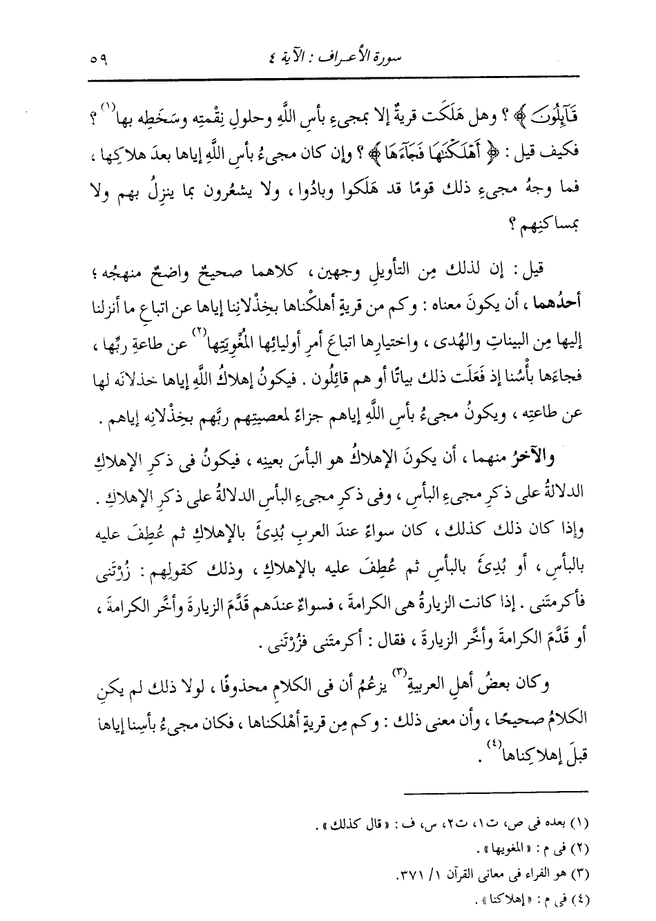 قَائِلُونَ} [الأعراف: 4] ، وَهَلْ هَلَكَتْ قَرْيَةٌ إِلَّا بِمَجِيءِ بَأْسِ اللَّهِ وَحُلُولِ نِقْمَتِهِ وَسَخَطِهِ بِهَا؟ فَكَيْفَ قِيلَ (أَهْلَكْنَاهَا فَجَاءَهَا) وَإِنْ كَانَ مَجِيءُ بَأْسِ اللَّهِ إِيَّاهَا بَعْدَ هَلَاكِهَا، فَمَا وَجْهُ مَجِيءِ ذَلِكَ قَوْمًا قَدْ هَلَكُوا وَبَادُوا وَلَا يَشْعُرُونَ بِمَا يَنْزِلُ بِهِمْ وَلَا بِمَسَاكِنِهِمْ؟ قِيلَ: إِنَّ لِذَلِكَ مِنَ التَّأْوِيلِ وَجْهَيْنِ كِلَاهُمَا صَحِيحٌ وَاضِحٌ مَنْهَجُهُ: أَحَدُهُمَا أَنْ يَكُونَ مَعْنَاهُ: وَكَمْ مِنْ قَرْيَةٍ أَهْلَكْنَاهَا بِخُذْلَانِنَا إِيَّاهَا عَنِ اتِّبَاعِ مَا أَنْزَلْنَا إِلَيْهَا مِنَ الْبَيِّنَاتِ وَالْهُدَى وَاخْتِيَارِهَا اتِّبَاعَ أَمْرِ أَوْلِيَائِهَا الْمُغْوِيهَا عَنْ طَاعَةِ رَبِّهَا، فَجَاءَهَا بَأْسُنَا إِذْ فَعَلَتْ ذَلِكَ بَيَاتًا، أَوْ هُمْ قَائِلُونَ. فَيَكُونُ إِهْلَاكُ اللَّهِ إِيَّاهَا: خِذْلَانُهُ لَهَا عَنْ طَاعَتِهِ، وَيَكُونُ مَجِيءُ بَأْسِ اللَّهِ إِيَّاهُمْ جَزَاءً لِمَعْصِيَتِهِمْ رَبَّهُمْ بِخِذْلَانِهِ إِيَّاهُمْ. وَالْآخَرُ مِنْهُمَا: أَنْ يَكُونَ الْإِهْلَاكُ هُوَ الْبَأْسُ بِعَيْنِهِ. فَيَكُونُ فِي ذِكْرِ الْإِهْلَاكِ الدَّلَالَةُ عَلَى ذِكْرِ مَجِيءِ الْبَأْسِ، وَفِي ذِكْرِ مَجِيءِ الْبَأْسِ الدَّلَالَةُ عَلَى ذِكْرِ الْإِهْلَاكِ. وَإِذَا كَانَ ذَلِكَ كَذَلِكَ، كَانَ سَوَاءً عِنْدَ الْعَرَبِ بُدِئَ بِالْإِهْلَاكِ ثُمَّ عُطِفَ عَلَيْهِ بِالْبَأْسِ، أَوْ بُدِئَ بِالْبَأْسِ ثُمَّ عُطِفَ عَلَيْهِ بِالْإِهْلَاكِ، وَذَلِكَ كَقَوْلِهِمْ: زُرْتَنِي فَأَكْرَمْتَنِي، إِذْ كَانَتِ الزِّيَارَةُ هِيَ الْكَرَامَةُ، فَسَوَاءٌ عِنْدَهُمْ قَدَّمَ الزِّيَارَةَ وَأَخَّرَ الْكَرَامَةَ، أَوْ قَدَّمَ الْكَرَامَةَ وَأَخَّرَ الزِّيَارَةَ، فَقَالَ: أَكْرَمْتَنِي فَزُرْتَنِي. وَكَانَ بَعْضُ أَهْلِ الْعَرَبِيَّةِ يَزْعُمُ أَنَّ فِيَ الْكَلَامِ مَحْذُوفًا، لَوْلَا ذَلِكَ لَمْ يَكُنِ الْكَلَامُ صَحِيحًا، وَأَنَّ مَعْنَى ذَلِكَ: وَكَمْ مِنْ قَرْيَةٍ أَهْلَكْنَاهَا، فَكَانَ مَجِيءُ بَأْسِنَا إِيَّاهَا قَبْلَ إِهْلَاكِنَا.