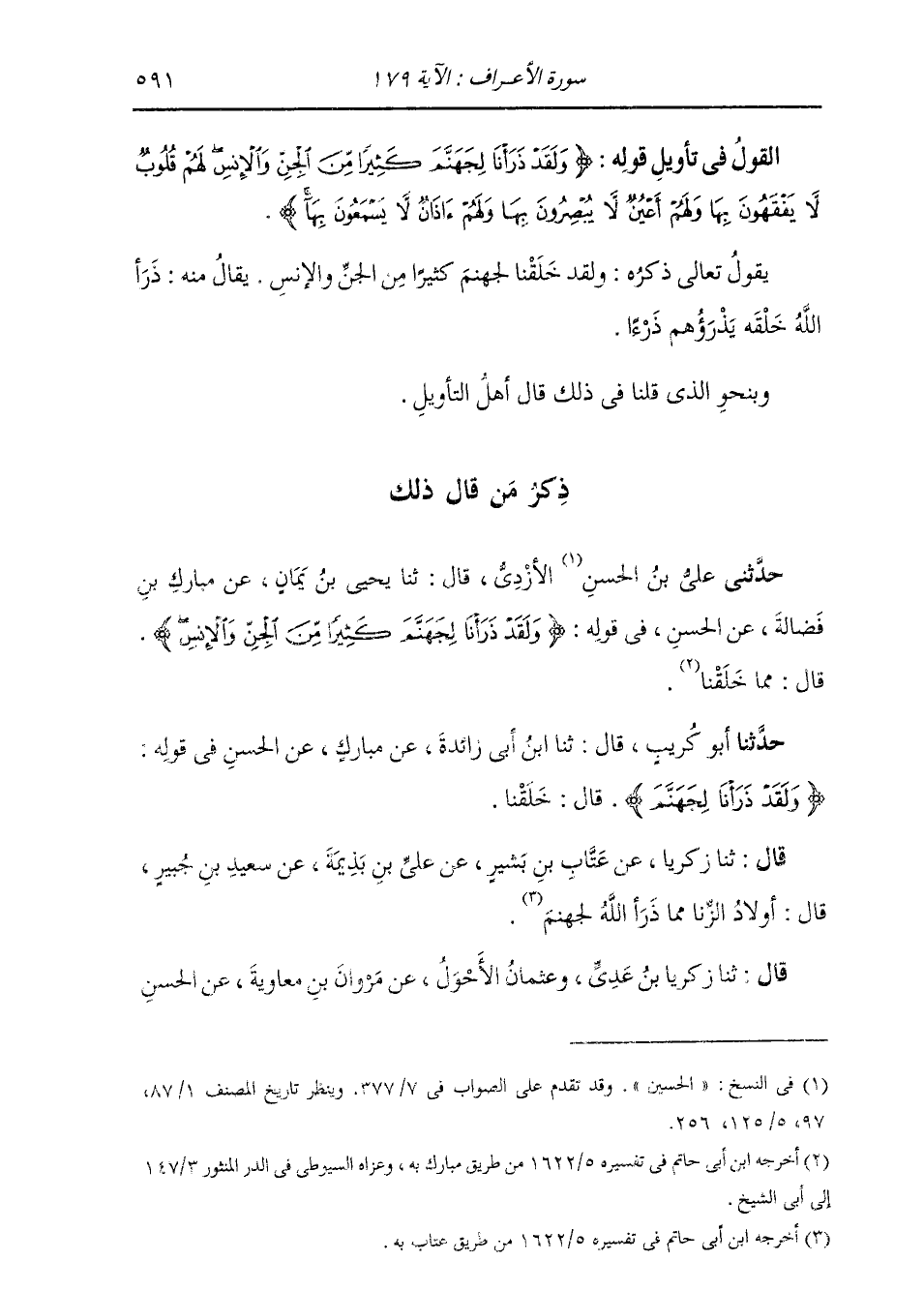 ذِكْرُ مَنْ قَالَ ذَلِكَ: حَدَّثَنِي عَلِيُّ بْنُ الْحُسَيْنِ الْأَزْدِيُّ، قَالَ: ثنا يَحْيَى بْنُ يَمَانٍ، عَنْ مُبَارَكِ بْنِ فَضَالَةَ، عَنِ الْحَسَنِ، فِي قَوْلِهِ: " {§وَلَقَدْ ذَرَأْنَا لِجَهَنَّمَ كَثِيرًا مِنَ الْجِنِّ وَالْإِنْسِ} [الأعراف: 179] قَالَ: مِمَّا خَلَقْنَا "