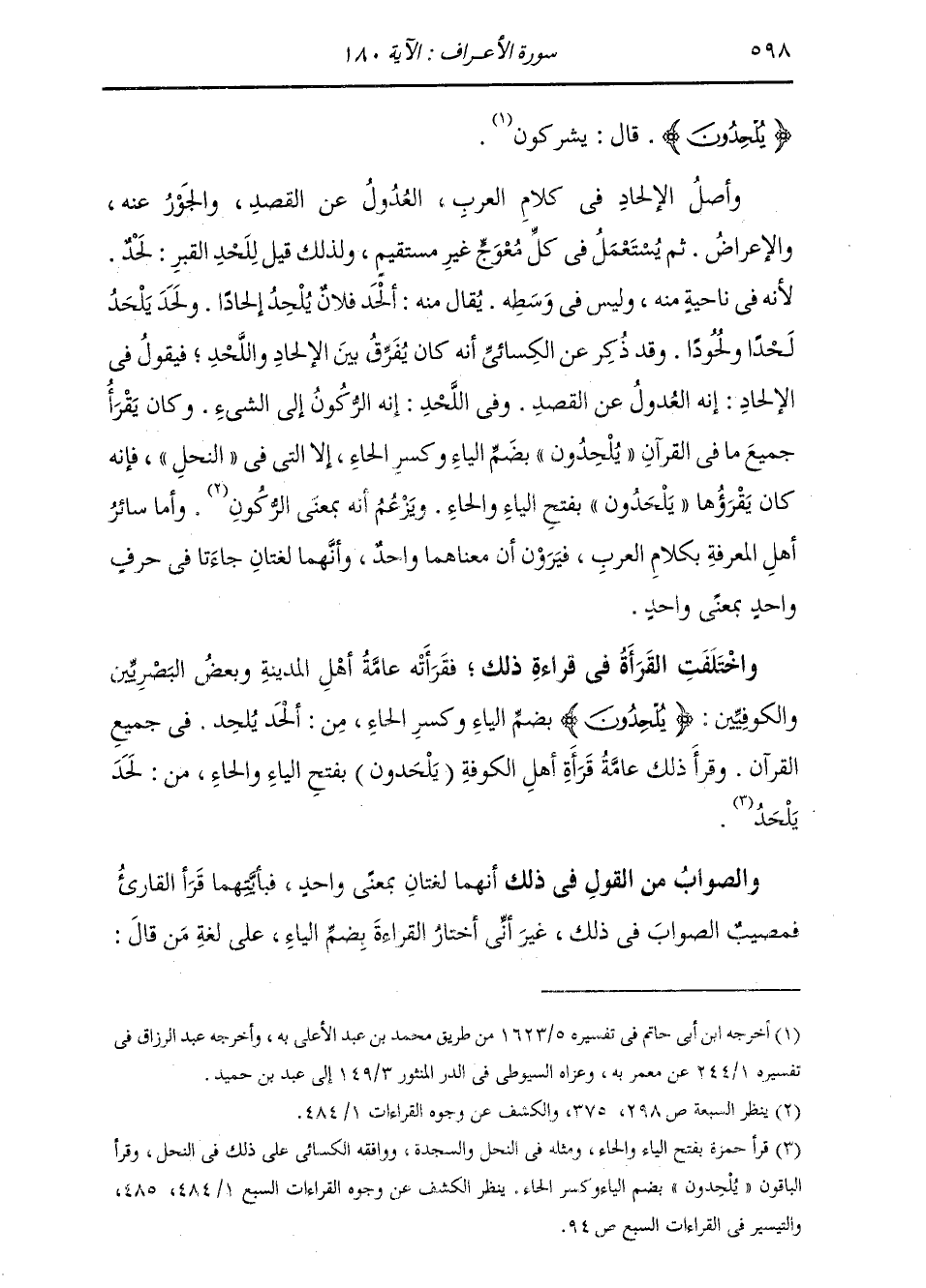 : " {§يُلْحِدُونَ} [الأعراف: 180] قَالَ: يُشْرِكُونَ " وَأَصْلُ الْإِلْحَادِ فِي كَلَامِ الْعَرَبِ: الْعُدُولُ عَنِ الْقَصْدِ، وَالْجَوْرُ عَنْهُ، وَالْإِعْرَاضُ، ثُمَّ يُسْتَعْمَلُ فِي كُلِّ مُعْوَجٍّ غَيْرِ مُسْتَقِيمٍ، وَلِذَلِكَ قِيلَ لِلَحْدِ الْقَبْرِ لَحْدٌ؛ لِأَنَّهُ فِي نَاحِيَةٍ مِنْهُ وَلَيْسَ فِي وَسَطِهِ، يُقَالُ مِنْهُ: أَلْحَدَ فُلَانٌ يُلْحِدُ إِلْحَادًا، وَلَحَدَ يَلْحَدُ لَحْدًا وَلُحُودًا وَقَدْ ذُكِرَ عَنِ الْكِسَائِيِّ أَنَّهُ كَانَ يُفَرِّقُ بَيْنَ الْإِلْحَادِ وَاللَّحْدِ، فَيَقُولُ فِي الْإِلْحَادِ: إِنَّهُ الْعُدُولُ عَنِ الْقَصْدِ، وَفِي اللَّحْدِ إِنَّهُ الرُّكُونُ إِلَى الشَّيْءِ، وَكَانَ يَقْرَأُ جَمِيعَ مَا فِي الْقُرْآنِ يُلْحِدُونَ بِضَمِّ الْيَاءِ وَكَسْرِ الْحَاءِ، إِلَّا الَّتِي فِي النَّحْلِ، فَإِنَّهُ كَانَ يَقْرَؤُهَا: (يَلْحَدُونَ) بِفَتْحِ الْيَاءِ وَالْحَاءِ، وَيَزْعُمُ أَنَّهُ بِمَعْنَى الرُّكُونِ. وَأَمَّا سَائِرُ أَلِ الْمَعْرِفَةِ بِكَلَامِ الْعَرَبِ فَيَرَوْنَ أَنَّ مَعْنَاهُمَا وَاحِدٌ، وَأَنَّهُمَا لُغَتَانِ جَاءَتَا فِي حَرْفٍ وَاحِدٍ بِمَعْنًى وَاحِدٍ. وَاخْتَلَفَتِ الْقُرَّاءُ فِي قِرَاءَةِ ذَلِكَ، فَقَرَأَتْهُ عَامَّةُ قُرَّاءِ أَهْلِ الْمَدِينَةِ وَبَعْضُ الْبَصْرِيِّينَ وَالْكُوفِيِّينَ: {يُلْحِدُونَ} [الأعراف: 180] بِضَمِّ الْيَاءِ وَكَسْرِ الْحَاءِ مِنْ أَلْحَدَ يُلْحِدُ فِي جَمِيعِ الْقُرْآنِ. وَقَرَأَ ذَلِكَ عَامَّةُ قُرَّاءِ أَهْلِ الْكُوفَةِ: (يَلْحَدُونَ) بِفَتْحِ الْيَاءِ وَالْحَاءِ مِنْ لَحَدَ يَلْحَدُ. وَالصَّوَابُ مِنَ الْقَوْلِ فِي ذَلِكَ أَنَّهُمَا لُغَتَانِ بِمَعْنًى وَاحِدٍ فَبِأَيَّتِهِمَا قَرَأَ الْقَارِئُ فَمُصِيبٌ الصَّوَابَ فِي ذَلِكَ. غَيْرَ أَنِّي أَخْتَارُ الْقِرَاءَةَ بِضَمِّ الْيَاءِ عَلَى لُغَةِ مَنْ قَالَ: