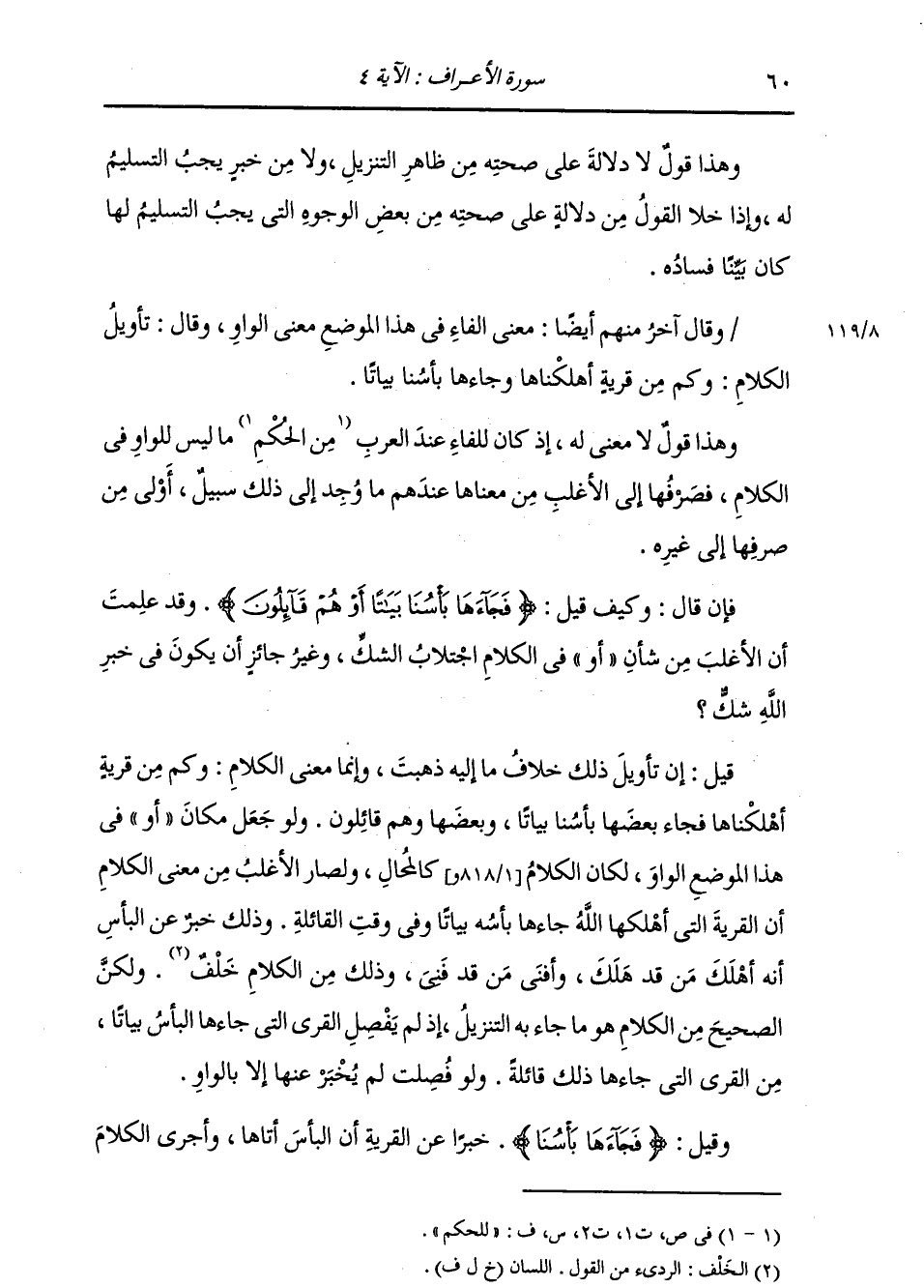وَهَذَا قَوْلٌ لَا دَلَالَةَ عَلَى صِحَّتِهِ مِنْ ظَاهِرِ التَّنْزِيلِ، وَلَا مِنْ خَبَرٍ يَجِبُ التَّسْلِيمُ لَهُ، وَإِذَا خَلَا الْقَوْلُ مِنْ دَلَالَةٍ عَلَى صِحَّتِهِ مِنْ بَعْضِ الْوُجُوهِ الَّتِي يَجِبُ التَّسْلِيمُ لَهَا كَانَ بَيِّنًا فَسَادُهُ. وَقَالَ آخَرُ مِنْهُمْ أَيْضًا: مَعْنَى الْفَاءِ فِي هَذَا الْمَوْضِعِ مَعْنَى الْوَاوِ، وَقَالَ: تَأْوِيلُ الْكَلَامِ: وَكَمْ مِنْ قَرْيَةٍ أَهْلَكْنَاهَا وَجَاءَهَا بَأْسُنَا بَيَاتًا. وَهَذَا قَوْلٌ لَا مَعْنَى لَهُ، إِذْ كَانَ لِلْفَاءِ عِنْدَ الْعَرَبِ مِنَ الْحُكْمِ مَا لَيْسَ لِلْوَاوِ فِي الْكَلَامِ، فَصَرْفُهَا إِلَى الْأَغْلَبِ مِنْ مَعْنَاهَا عِنْدَهُمْ مَا وُجِدَ إِلَى ذَلِكَ سَبِيلٌ أَوْلَى مِنْ صَرْفِهَا إِلَى غَيْرِهِ. فَإِنْ قَالَ: كَيْفَ قِيلَ: {فَجَاءَهَا بَأْسُنَا بَيَاتًا أَوْ هُمْ قَائِلُونَ} [الأعراف: 4] ، وَقَدْ عَلِمْتَ أَنَّ الْأَغْلَبَ مِنْ شَأْنِ (أَوْ) فِي الْكَلَامِ اجْتِلَابُ الشَّكِّ، وَغَيْرُ جَائِزٍ أَنْ يَكُونَ فِي خَبَرِ اللَّهِ شَكٌّ؟ قِيلَ: إِنَّ تَأْوِيلَ ذَلِكَ خِلَافُ مَا إِلَيْهِ ذَهَبْتَ، وَإِنَّمَا مَعْنَى الْكَلَامِ: وَكَمْ مِنْ قَرْيَةٍ أَهْلَكْنَاهَا فَجَاءَ بَعْضَهَا بَأْسَنَا بَيَاتًا، وَبَعْضَهَا وَهُمْ قَائِلُونَ. وَلَوْ جَعَلَ مَكَانَ (أَوْ) فِي هَذَا الْمَوْضِعِ الْوَاوَ لَكَانَ الْكَلَامُ كَالْمُحَالِ، وَلَصَارَ الْأَغْلَبُ مِنْ مَعْنَى الْكَلَامِ: إِنَّ الْقَرْيَةَ الَّتِي أَهْلَكَهَا اللَّهُ جَاءَهَا بَأْسُهُ بَيَاتًا، وَفِي وَقْتِ الْقَائِلَةِ، وَذَلِكَ خَبَرٌ عَنِ الْبَأْسِ أَنَّهُ أَهْلَكَ مَنْ قَدْ هَلَكَ وَأَفْنَى مَنْ قَدْ فَنِيَ، وَذَلِكَ مِنَ الْكَلَامِ خُلْفٌ، وَلَكِنَّ الصَّحِيحَ مِنَ الْكَلَامِ هُوَ مَا جَاءَ بِهِ التَّنْزِيلُ، إِذْ لَمْ يَفْصِلِ الْقُرَى الَّتِي جَاءَهَا الْبَأْسُ بَيَاتًا مِنَ الْقُرَى الَّتِي جَاءَهَا ذَلِكَ قَائِلَةً، وَلَوْ فُصِلَتْ لَمْ يُخْبَرْ عَنْهَا إِلَّا بِالْوَاوِ. وَقِيلَ: (فَجَاءَهَا بَأْسُنَا) خَبَرًا عَنِ الْقَرْيَةِ أَنَّ الْبَأْسَ أَتَاهَا، وَأَجْرَى الْكَلَامَ