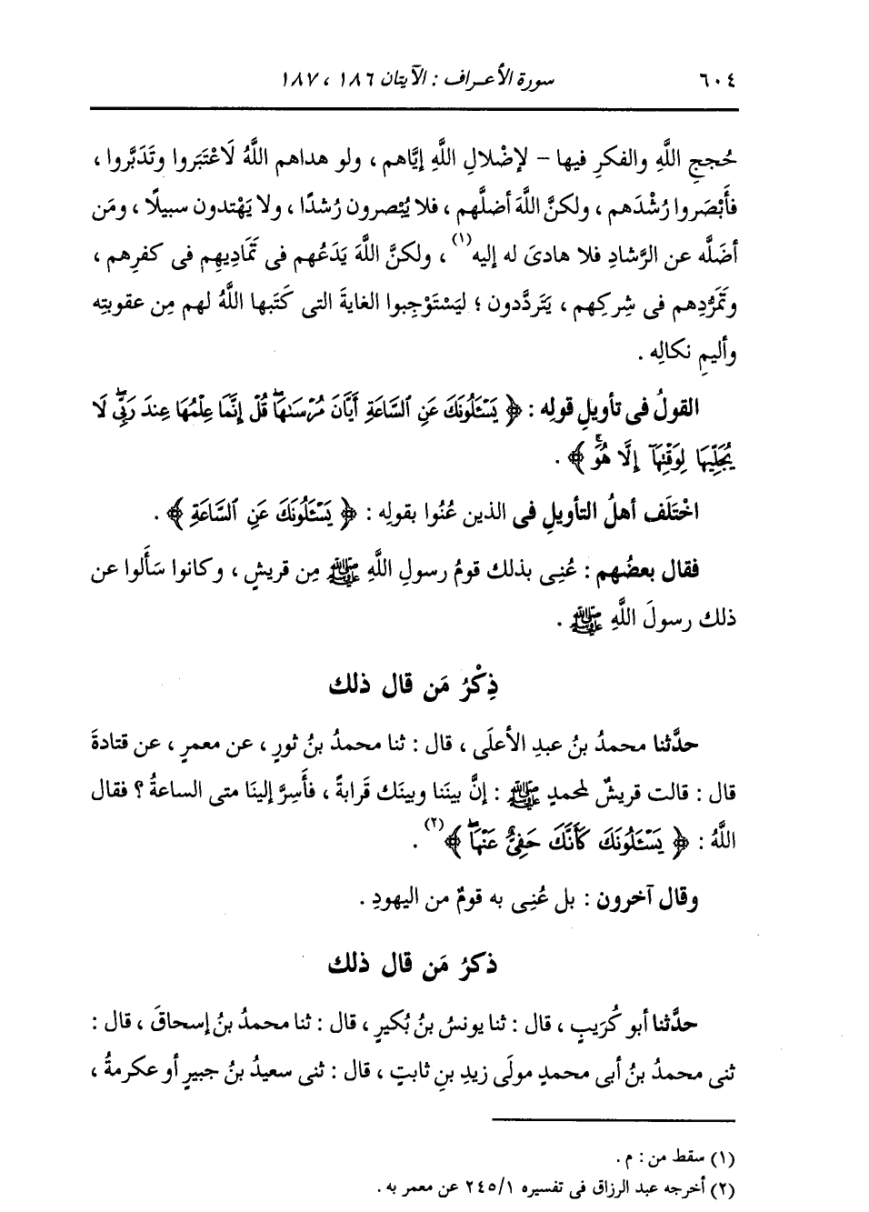 §الْقَوْلُ فِي تَأْوِيلِ قَوْلِهِ تَعَالَى: {يَسْأَلُونَكَ عَنِ السَّاعَةِ أَيَّانَ مُرْسَاهَا قُلْ إِنَّمَا عِلْمُهَا عِنْدَ رَبِّي لَا يُجَلِّيهَا لِوَقْتِهَا إِلَّا هُوَ ثَقُلَتْ فِي السَّمَاوَاتِ وَالْأَرْضِ لَا تَأْتِيكُمْ إِلَّا بَغْتَةً يَسْأَلُونَكَ كَأَنَّكَ حَفِيٌّ عَنْهَا قُلْ إِنَّمِا عِلْمُهَا عِنْدَ اللَّهِ وَلَكِنَّ أَكْثَرَ النَّاسِ لَا يَعْلَمُونَ} [الأعراف: 187] اخْتَلَفَ أَهْلُ التَّأْوِيلِ فِي الَّذِينَ عُنُوا بِقَوْلِهِ: {يَسْأَلُونَكَ عَنِ السَّاعَةِ} [الأعراف: 187] فَقَالَ بَعْضُهُمْ: عُنِيَ بِذَلِكَ قَوْمُ رَسُولِ اللَّهِ صَلَّى اللهُ عَلَيْهِ وَسَلَّمَ مِنْ قُرَيْشٍ، وَكَانُوا سَأَلُوا عَنْ ذَلِكَ رَسُولَ اللَّهِ صَلَّى اللهُ عَلَيْهِ وَسَلَّمَ
