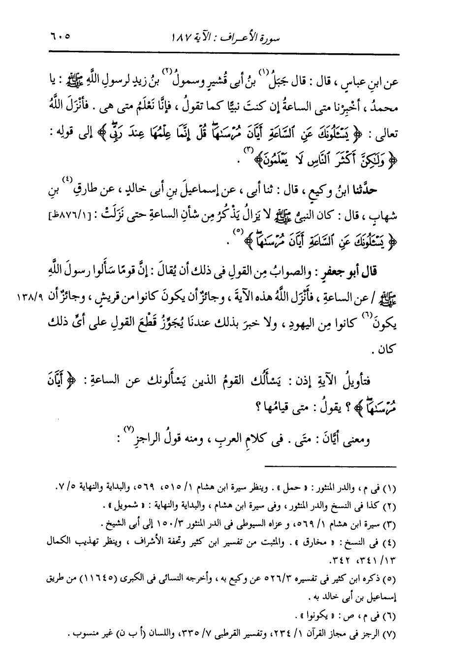 حَدَّثَنَا ابْنُ وَكِيعٍ، قَالَ: ثنا أَبِي، عَنْ إِسْمَاعِيلَ بْنِ أَبِي خَالِدٍ، عَنْ طَارِقِ بْنِ شِهَابٍ، قَالَ: " §كَانَ النَّبِيُّ صَلَّى اللهُ عَلَيْهِ وَسَلَّمَ لَا يَزَالُ يَذْكُرُ مِنْ شَأْنِ السَّاعَةِ حَتَّى نَزَلَتْ: {يَسْأَلُونَكَ عَنِ السَّاعَةِ أَيَّانَ مُرْسَاهَا} [الأعراف: 187] " قَالَ أَبُو جَعْفَرٍ: وَالصَّوَابُ مِنَ الْقَوْلِ فِي ذَلِكَ أَنْ يُقَالَ: إِنَّ قَوْمًا سَأَلُوا رَسُولَ اللَّهِ صَلَّى اللهُ عَلَيْهِ وَسَلَّمَ عَنِ السَّاعَةِ، فَأَنْزَلَ اللَّهُ هَذِهِ الْآيَةَ، وَجَائِزٌ أَنْ يَكُونَ كَانُوا مِنْ قُرَيْشٍ، وَجَائِزٌ أَنْ يَكُونُوا كَانُوا مِنَ الْيَهُودِ، وَلَا خَبَرَ بِذَلِكَ عِنْدَنَا يَجُوزُ قَطْعُ الْقَوْلِ عَلَى أَيِّ ذَلِكَ كَانَ. فَتَأْوِيلُ الْآيَةِ إِذَنْ: يَسْأَلُكَ الْقَوْمُ الَّذِينَ يَسْأَلُونَكَ عَنِ السَّاعَةِ أَيَّانَ مُرْسَاهَا، يَقُولُ: مَتَى قِيَامُهَا. وَمَعْنَى «أَيَّانَ» : «مَتَى» فِي كَلَامِ الْعَرَبِ، وَمِنْهُ قَوْلُ الرَّاجِزِ: