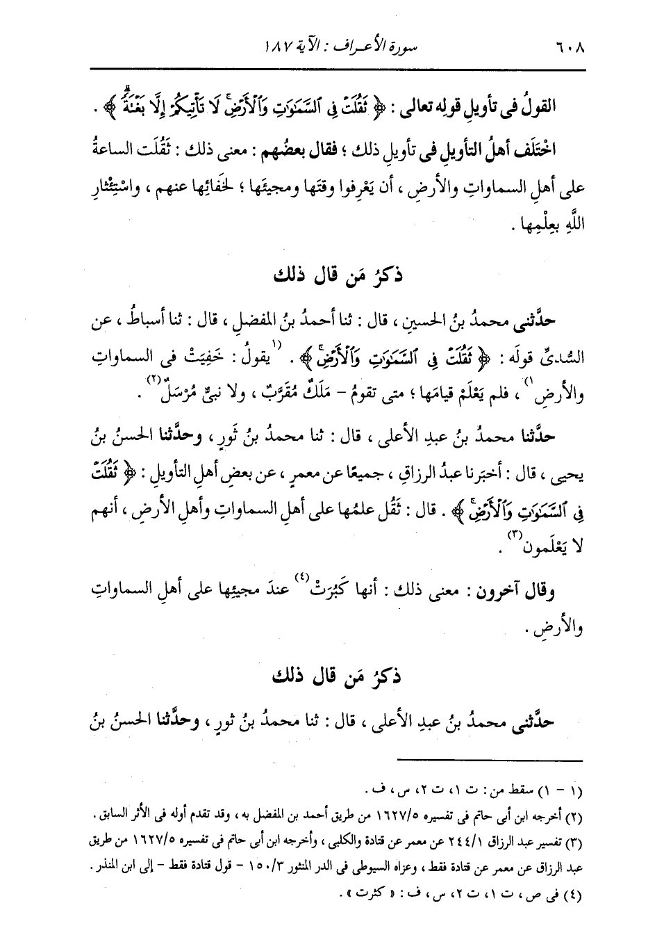 حَدَّثَنَا مُحَمَّدُ بْنُ عَبْدِ الْأَعْلَى، قَالَ: ثنا مُحَمَّدُ بْنُ ثَوْرٍ، وَحَدَّثَنَا الْحَسَنُ بْنُ يَحْيَى، قَالَ: أَخْبَرَنَا عَبْدُ الرَّزَّاقِ، جَمِيعًا، عَنْ مَعْمَرٍ، عَنْ بَعْضِ، أَهْلِ التَّأْوِيلِ: " {§ثَقُلَتْ فِي السَّمَوَاتِ وَالْأَرْضِ} قَالَ: ثَقُلَ عِلْمُهَا عَلَى أَهْلِ السَّمَوَاتِ وَأَهْلِ الْأَرْضِ أَنَّهُمْ لَا يَعْلَمُونَ " وَقَالَ آخَرُونَ: مَعْنَى ذَلِكَ: أَنَّهَا كَبُرَتْ عِنْدَ مَجِيئِهَا عَلَى أَهْلِ السَّمَوَاتِ وَالْأَرْضِ