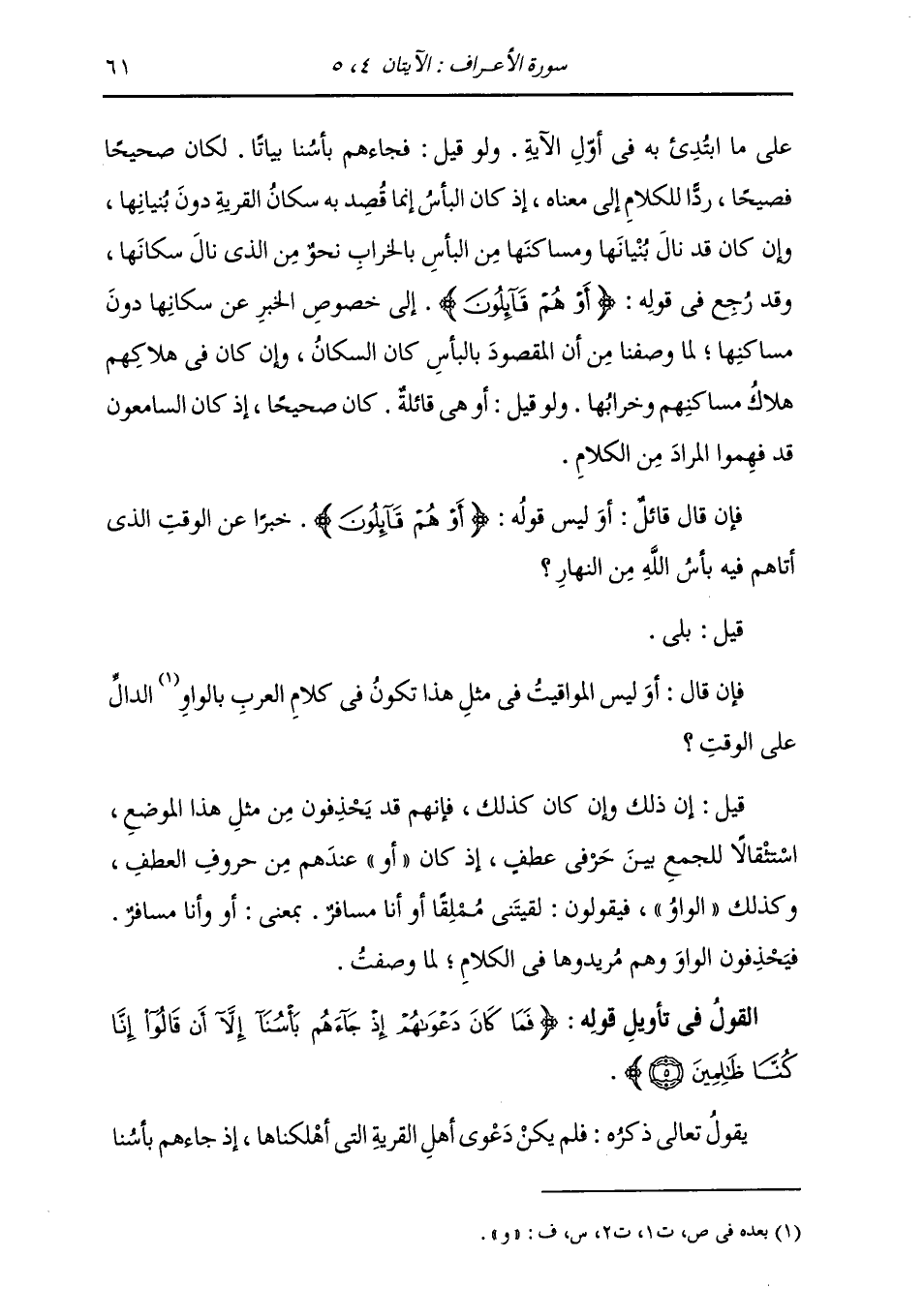 عَلَى مَا ابْتُدِئَ بِهِ فِي أَوَّلِ الْآيَةِ، وَلَوْ قِيلَ: فَجَاءَهُمْ بَأْسُنَا بَيَاتًا لَكَانَ صَحِيحًا فَصِيحًا رَدًّا لِلْكَلَامِ إِلَى مَعْنَاهُ، إِذْ كَانَ الْبَأْسُ إِنَّمَا قُصِدَ بِهِ سُكَّانُ الْقَرْيَةِ دُونَ بُنْيَانِهَا، وَإِنْ كَانَ قَدْ نَالَ بُنْيَانَهَا وَمَسَاكِنَهَا مِنَ الْبَأْسِ بِالْخَرَابِ نَحْوٌ مِنَ الَّذِي نَالَ سُكَّانَهَا. وَقَدْ رَجَعَ فِي قَوْلِهِ: {أَوْ هُمْ قَائِلُونَ} [الأعراف: 4] إِلَى خُصُوصِ الْخَبَرِ عَنْ سُكَّانِهَا دُونَ مَسَاكِنِهَا لِمَا وَصَفْنَا مِنْ أَنَّ الْمَقْصُودَ بِالْبَأْسِ كَانَ السُّكَّانَ وَإِنْ كَانَ فِي هَلَاكِهِمْ هَلَاكُ مَسَاكِنِهِمْ وَخَرَابُهَا. وَلَوْ قِيلَ: (أَوْ هِيَ قَائِلَةٌ) كَانَ صَحِيحًا إِذْ كَانَ السَّامِعُونَ قَدْ فَهِمُوا الْمُرَادَ مِنَ الْكَلَامِ. فَإِنْ قَالَ قَائِلٌ: أَوَ لَيْسَ قَوْلُهُ: {أَوْ هُمْ قَائِلُونَ} [الأعراف: 4] خَبَرًا عَنِ الْوَقْتِ الَّذِي أَتَاهُمْ فِيهِ بَأْسُ اللَّهِ مِنَ النَّهَارِ؟ قِيلَ: بَلَى. فَإِنْ قَالَ: أَوَ لَيْسَ الْمَوَاقِيتُ فِي مِثْلِ هَذَا تَكُونُ فِي كَلَامِ الْعَرَبِ بِالْوَاوِ الدَّالِّ عَلَى الْوَقْتِ؟ قِيلَ: إِنَّ ذَلِكَ وَإِنْ كَانَ كَذَلِكَ، فَإِنَّهُمْ قَدْ يَحْذِفُونَ مِنْ مِثْلِ هَذَا الْمَوْضِعِ اسْتِثْقَالًا لِلْجَمْعِ بَيْنَ حَرْفَيْ عَطْفٍ، إِذْ كَانَ (أَوْ) عِنْدَهُمْ مِنْ حُرُوفِ الْعَطْفِ، وَكَذَلِكَ الْوَاوُ، فَيَقُولُونَ: لَقِيتَنِي مُمْلِقًا أَوْ أَنَا مُسَافِرٌ، بِمَعْنَى: أَوْ أَنَا مُسَافِرٌ، فَيَحْذِفُونَ الْوَاوَ وَهُمْ مُرِيدُوهَا فِي الْكَلَامِ لِمَا وَصَفْتُ