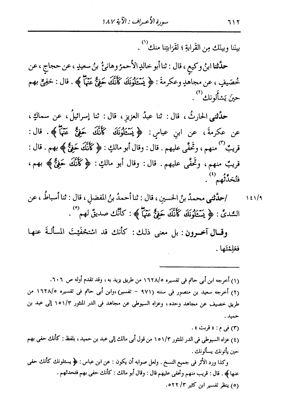 حَدَّثَنَا ابْنُ وَكِيعٍ، قَالَ: ثنا أَبُو خَالِدٍ الْأَحْمَرُ، وَهَانِئُ بْنُ سَعِيدٍ، عَنْ حَجَّاجٍ، عَنْ خُصَيْفٍ، عَنْ مُجَاهِدٍ، وَعِكْرِمَةَ: " {§يَسْأَلُونَكَ كَأَنَّكَ حَفِيُّ عَنْهَا} [الأعراف: 187] قَالَ: حَفِيُّ بِهِمْ حِينَ يَسْأَلُونَكَ "