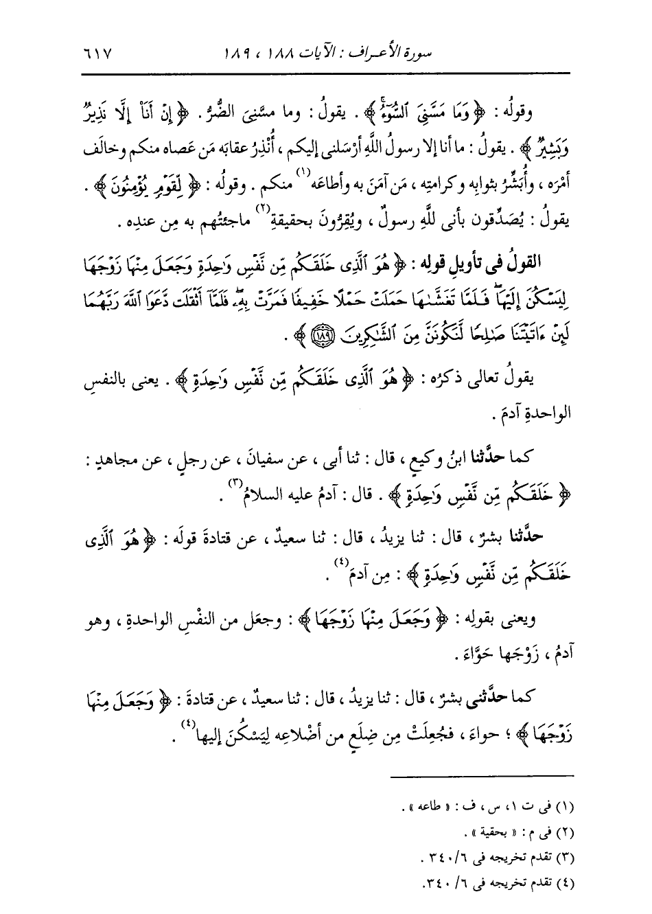 حَدَّثَنَا بِشْرٌ، قَالَ: ثنا يَزِيدُ، قَالَ: ثنا سَعِيدٌ، عَنْ قَتَادَةَ، قَوْلُهُ: " {§هُوَ الَّذِي خَلَقَكُمْ مِنْ نَفْسٍ وَاحِدَةٍ} [الأعراف: 189] مِنْ آدَمَ " وَيَعْنِي بِقَوْلِهِ: {وَجَعَلَ مِنْهَا زَوْجَهَا} [الأعراف: 189] وَجَعَلَ مِنَ النَّفْسِ الْوَاحِدَةِ، وَهُوَ آدَمُ، زَوْجَهَا حَوَّاءَ