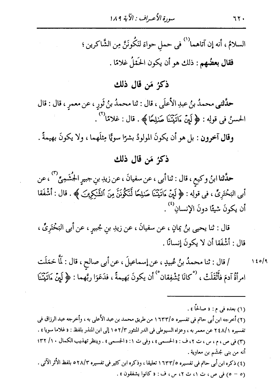 ذِكْرُ مَنْ قَالَ ذَلِكَ: حَدَّثَنِي مُحَمَّدُ بْنُ عَبْدِ الْأَعْلَى، قَالَ: ثنا مُحَمَّدُ بْنُ ثَوْرٍ، عَنْ مَعْمَرٍ، قَالَ: قَالَ الْحَسَنُ فِي قَوْلِهِ: " {§لَئِنْ آتَيْتَنَا صَالِحًا} [الأعراف: 189] قَالَ: غُلَامًا " وَقَالَ آخَرُونَ: بَلْ هُوَ أَنْ يَكُونَ الْمَوْلُودُ بَشَرًا سَوِيًّا مِثْلَهُمَا، وَلَا يَكُونَ بَهِيمَةً
