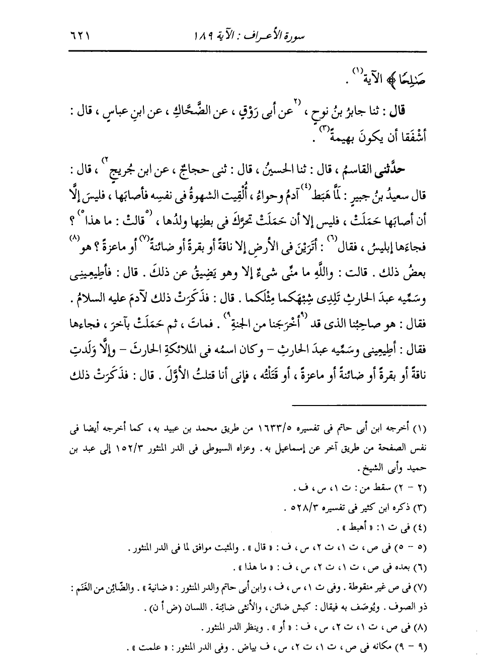 حَدَّثَنِي الْقَاسِمُ، قَالَ: ثنا الْحُسَيْنُ، قَالَ: ثني حَجَّاجٌ، عَنِ ابْنِ جُرَيْجٍ، قَالَ: قَالَ سَعِيدُ بْنُ جُبَيْرٍ: " §لَمَّا هَبَطَ آدَمُ وَحَوَّاءُ، أُلْقِيَتِ الشَّهْوَةُ فِي نَفْسِهِ فَأَصَابَهَا، فَلَيْسَ إِلَّا أَنْ أَصَابَهَا حَمَلَتْ، فَلَيْسَ إِلَّا أَنْ حَمَلَتْ تُحَرَّكَ فِي بَطْنِهَا وَلَدُهَا، قَالَتْ: مَا هَذَا؟ فَجَاءَهَا إِبْلِيسُ، فَقَالَ: أَتَرَيْنَ فِي الْأَرْضِ إِلَّا نَاقَةً أَوْ بَقَرَةً أَوْ ضَائِنَةً أَوْ مَاعِزَةً؟ هُوَ بَعْضُ ذَلِكَ. قَالَتْ: وَاللَّهِ مَا مِنِّي شَيْءٌ إِلَّا وَهُوَ يَضِيقُ عَنْ ذَلِكَ. قَالَ: فَأَطِيعِينِي وَسَمِّيهِ عَبْدَ الْحَارِثِ تَلِدِي شِبْهَكُمَا مِثْلَكُمَا، قَالَ: فَذَكَرَتْ ذَلِكَ لِآدَمَ عَلَيْهِ السَّلَامُ، فَقَالَ: هُوَ صَاحِبُنَا الَّذِي قَدْ أَخْرَجَنَا مِنَ الْجَنَّةِ، فَمَاتَ، ثُمَّ حَمَلَتْ بِآخَرَ، فَجَاءَهَا فَقَالَ: أَطِيعِينِي وَسَمِّيهِ عَبْدَ الْحَارِثِ وَكَانَ اسْمُهُ فِي الْمَلَائِكَةِ الْحَارِثَ وَإِلَّا وَلَدْتِ نَاقَةً أَوْ بَقَرَةً أَوْ ضَائِنَةً أَوْ مَاعِزَةً، أَوْ قَتَلْتُهُ، فَإِنِّي أَنَا قَتَلْتُ الْأَوَّلَ، قَالَ: فَذَكَرْتُ ذَلِكَ -[622]- لِآدَمَ، فَكَأَنَّهُ لَمْ يَكْرَهْهُ، فَسَمَّتْهُ عَبْدَ الْحَارِثِ، فَذَلِكَ قَوْلُهُ: {لَئِنْ آتَيْتَنَا صَالِحًا} [الأعراف: 189] يَقُولُ: شِبْهَنَا مِثْلَنَا، {فَلَمَّا آتَاهُمَا صَالِحًا} [الأعراف: 190] قَالَ: شِبْهَهُمَا مِثْلَهُمَا "
