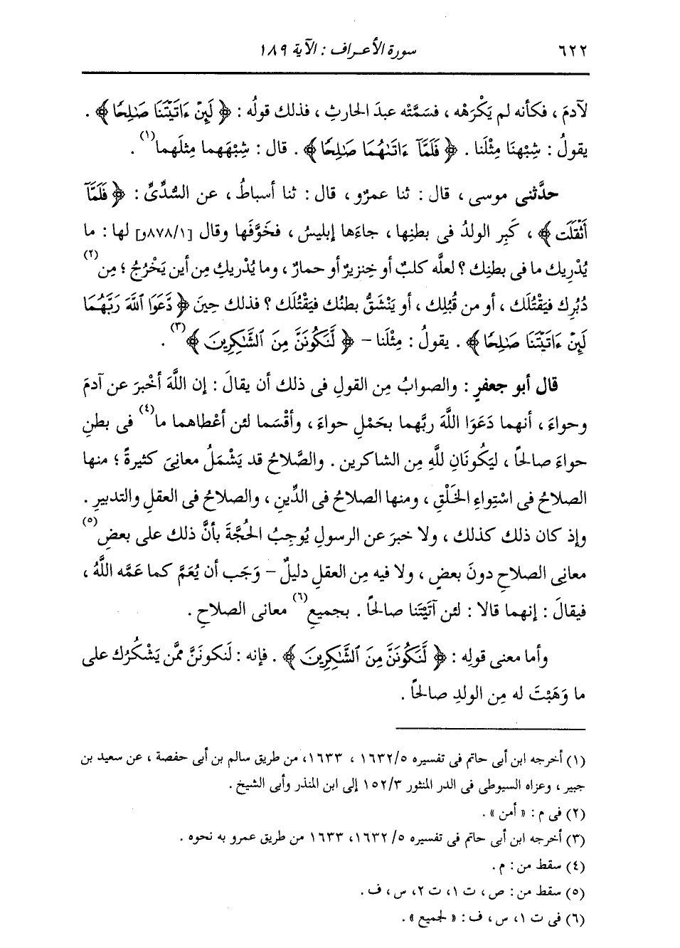 حَدَّثَنِي مُوسَى، قَالَ: ثنا عَمْرٌو، قَالَ: ثنا أَسْبَاطٌ، عَنِ السُّدِّيِّ: " {§فَلَمَّا أَثْقَلَتْ} [الأعراف: 189] كَبِرَ الْوَلَدُ فِي بَطْنِهَا جَاءَهَا إِبْلِيسُ، فَخَوَّفَهَا وَقَالَ لَهَا: مَا يُدْرِيكِ مَا فِي بَطْنِكِ، لَعَلَّهُ كَلْبٌ أَوْ خِنْزِيرٌ أَوْ حِمَارٌ؟ وَمَا يُدْرِيكِ مِنْ أَيْنَ يَخْرُجُ؟ أَمِنْ دُبُرِكِ فَيَقْتُلَكِ، أَوْ مِنْ قُبُلِكِ، أَوْ يَنْشَقُّ بَطْنُكِ فَيَقْتُلُكِ؟ فَذَلِكَ حِينَ {دَعَوَا اللَّهَ رَبَّهُمَا لَئِنْ آتَيْتَنَا صَالِحًا} [الأعراف: 189] يَقُولُ: مِثْلَنَا، {لَنَكُونَنَّ مِنَ الشَّاكِرِينَ} [الأعراف: 188] " قَالَ أَبُو جَعْفَرٍ: وَالصَّوَابُ مِنَ الْقَوْلِ فِي ذَلِكَ أَنْ يُقَالَ: إِنَّ اللَّهَ أَخْبَرَ عَنْ آدَمَ وَحَوَّاءَ أَنَّهُمَا دَعَوَا اللَّهَ رَبَّهُمَا بِحَمْلِ حَوَّاءَ، وَأَقْسَمَا لَئِنْ أَعْطَاهُمَا فِي بَطْنِ حَوَّاءَ صَالِحًا لَيَكُونَانَّ لِلَّهِ مِنَ الشَّاكِرِينَ. وَالصَّلَاحُ قَدْ يَشْمَلُ مَعَانِيَ كَثِيرَةً. مِنْهَا الصَّلَاحُ فِي اسْتِوَاءِ الْخَلْقِ. وَمِنْهَا الصَّلَاحُ فِي الدِّينِ، وَالصَّلَاحُ فِي الْعَقْلِ وَالتَّدْبِيرِ. وَإِذْ كَانَ ذَلِكَ كَذَلِكَ، وَلَا خَبَرَ عَنِ الرَّسُولِ يُوجِبُ الْحُجَّةَ بِأَنَّ ذَلِكَ عَلَى بَعْضِ مَعَانِي الصَّلَاحِ دُونَ بَعْضٍ، وَلَا فِيهِ مِنَ الْعَقْلِ دَلِيلٌ وَجَبَ أَنْ يَعُمَّ كَمَا عَمَّهُ اللَّهُ، فَيُقَالَ إِنَّهُمَا قَالَا لَئِنْ آتَيْتَنَا صَالِحًا بِجَمِيعِ مَعَانِي الصَّلَاحِ. وَأَمَّا مَعْنَى قَوْلِهِ: {لَنَكُونَنَّ مِنَ الشَّاكِرِينَ} [الأعراف: 188] فَإِنَّهُ لَنَكُونَنَّ مِمَّنْ يَشْكُرُكَ عَلَى مَا وَهَبَتْ لَهُ مِنَ الْوَلَدِ صَالِحًا