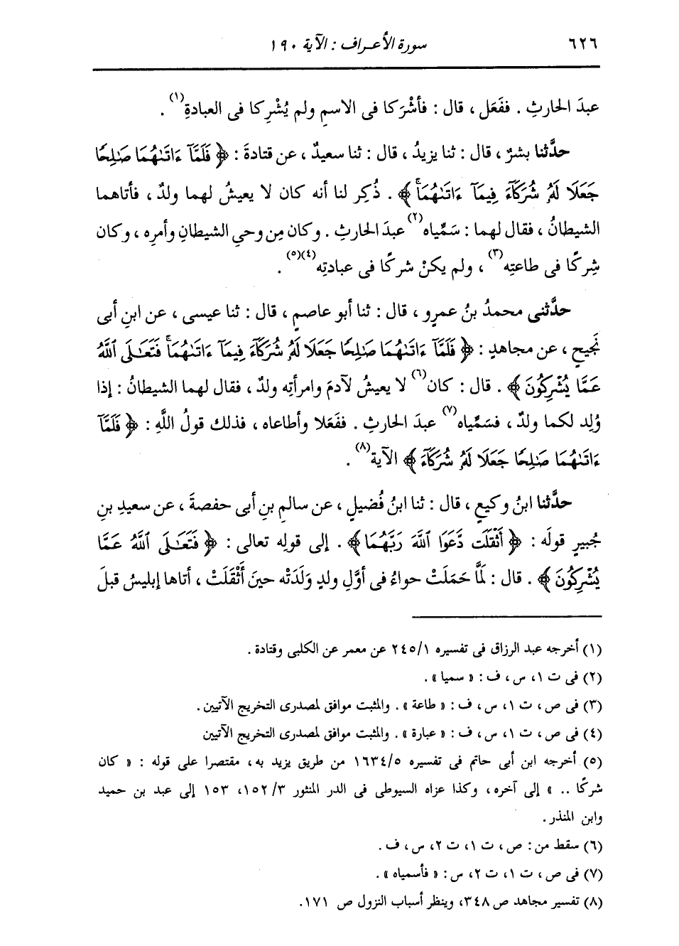 حَدَّثَنَا بِشْرٌ، قَالَ: ثنا يَزِيدُ، قَالَ: ثنا سَعِيدٌ، عَنْ قَتَادَةَ: " {§فَلَمَّا آتَاهُمَا صَالِحًا جَعَلَا لَهُ شُرَكَاءَ فِيمَا آتَاهُمَا} [الأعراف: 190] ذُكِرَ لَنَا أَنَّهُ كَانَ لَا يَعِيشُ لَهُمَا وَلَدٌ، فَأَتَاهُمَا الشَّيْطَانُ، فَقَالَ لَهُمَا: سَمِّيَاهُ عَبْدَ الْحَارِثِ، وَكَانَ مِنْ وَحْيِ الشَّيْطَانِ وَأَمْرِهِ، وَكَانَ شِرْكًا فِي طَاعَتِهِ، وَلَمْ يَكُنْ شِرْكًا فِي عِبَادَتِهِ "