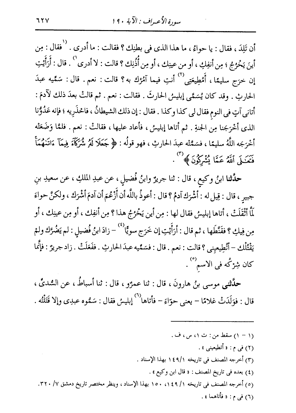 حَدَّثَنَا ابْنُ وَكِيعٍ، قَالَ: ثنا جَرِيرٌ، وَابْنُ فُضَيْلٍ، عَنْ عَبْدِ الْمَلِكِ، عَنْ سَعِيدِ بْنِ جُبَيْرٍ، قَالَ: " §قِيلَ لَهُ: أَشْرَكَ آدَمُ؟ قَالَ: أَعُوذُ بِاللَّهِ أَنْ أَزْعُمَ أَنَّ آدَمَ أَشْرَكَ، وَلَكِنَّ حَوَّاءَ لَمَّا أَثْقَلَتْ، أَتَاهَا إِبْلِيسُ فَقَالَ لَهَا: مِنْ أَيْنَ يَخْرُجُ هَذَا مِنْ أَنْفِكِ أَوْ مِنْ عَيْنِكِ أَوْ مِنْ فِيكِ؟ فَقَنَّطَهَا، ثُمَّ قَالَ: أَرَأَيْتِ إِنْ خَرَجَ سَوِيًّا زَادَ ابْنُ فُضَيْلٍ لَمْ يَضُرَّكِ وَلَمْ يَقْتُلْكِ أَتُطِيعِينِي؟ قَالَتْ: نَعَمْ. قَالَ: فَسَمِّيهِ عَبْدَ الْحَارِثِ، فَفَعَلَتْ. زَادَ جَرِيرٌ: فَإِنَّمَا كَانَ شِرْكُهُ فِي الِاسْمِ "