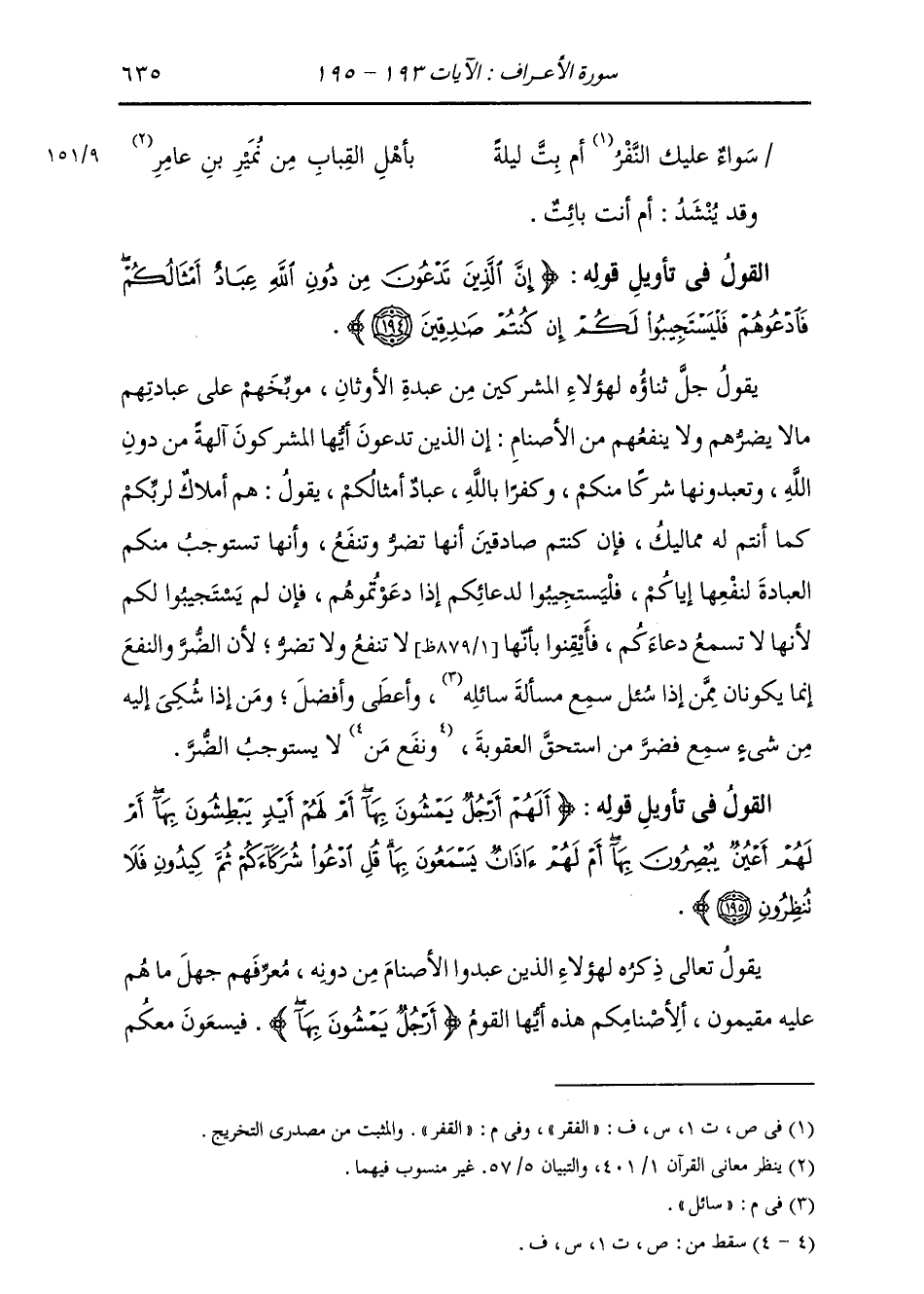 §الْقَوْلُ فِي تَأْوِيلِ قَوْلِهِ تَعَالَى: {إِنَّ الَّذِينَ تَدْعُونَ مِنْ دُونِ اللَّهِ عِبَادٌ أَمْثَالُكُمْ فَادْعُوهُمْ فَلْيَسْتَجِيبُوا لَكُمْ إِنْ كُنْتُمْ صَادِقِينَ} [الأعراف: 194] يَقُولُ جَلَّ ثَنَاؤُهُ لِهَؤُلَاءِ الْمُشْرِكِينَ مِنْ عَبَدَةِ الْأَوْثَانِ مُوَبِّخُهُمْ عَلَى عِبَادَتِهِمْ مَا لَا يَضُرُّهُمْ وَلَا يَنْفَعُهُمْ مِنَ الْأَصْنَامِ: إِنَّ الَّذِينَ تَدْعُونَ أَيُّهَا الْمُشْرِكُونَ آلِهَةً مِنْ دُونِ اللَّهِ، وتَعْبُدُونَهَا شِرْكًا مِنْكُمْ وَكُفْرًا بِاللَّهِ، {عِبَادٌ أَمْثَالُكُمْ} [الأعراف: 194] يَقُولُ: هُمْ أَمْلَاكٌ لِرَبِّكُمْ، كَمَا أَنْتُمْ لَهُ مَمَالِيكُ. فَإِنْ كُنْتُمْ صَادِقِينَ أَنَّهَا تَضُرُّ وَتَنْفَعُ وَأَنَّهَا تَسْتَوْجِبُ مِنْكُمُ الْعِبَادَةَ لِنَفْعِهَا إِيَّاكُمْ، فَلْيَسْتَجِيبُوا لِدُعَائِكُمْ إِذَا دَعَوْتُمُوهُمْ، فَإِنْ لَمْ يَسْتَجِيبُوا لَكُمْ لِأَنَّهَا لَا تَسْمَعُ دُعَاءَكُمْ، فَأَيْقِنُوا بِأَنَّهَا لَا تَنْفَعُ وَلَا تَضُرُّ؛ لِأَنَّ الضُّرَّ وَالنَّفْعَ إِنَّمَا يَكُونَانِ مِمَّنْ إِذَا سُئِلَ سَمِعَ مَسْأَلَةَ سَائِلٍ وَأَعْطَى وَأَفْضَلَ، وَمَنْ إِذَا شُكِيَ إِلَيْهِ مِنْ شَيْءٍ سَمِعَ فَضَرَّ مَنِ اسْتَحَقَّ الْعُقُوبَةَ وَنَفَعَ مَنْ لَا يَسْتَوْجِبُ الضُّرَّ