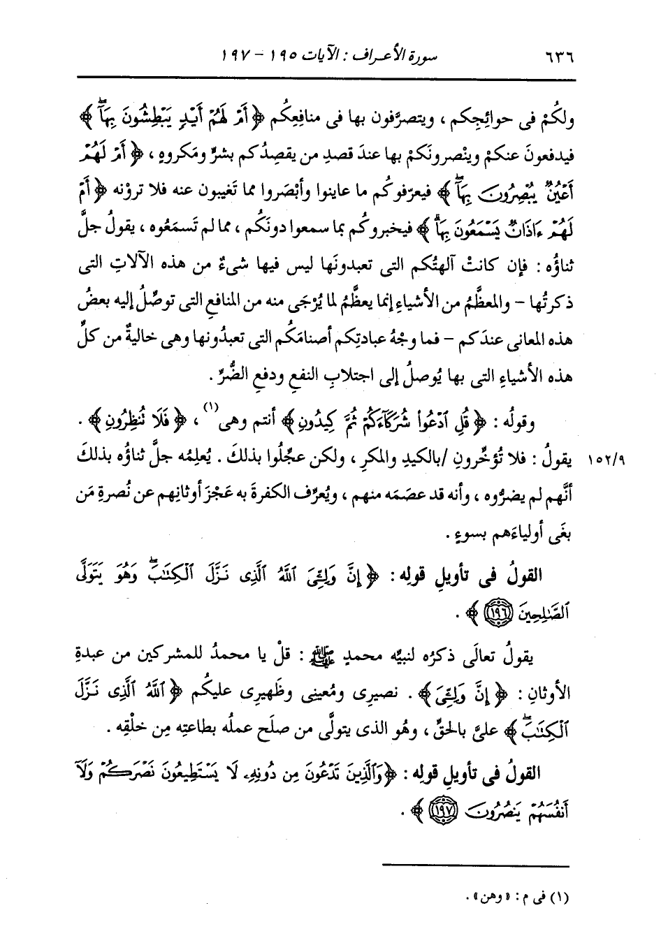 §الْقَوْلُ فِي تَأْوِيلِ قَوْلِهِ تَعَالَى: {وَالَّذِينَ تَدْعُونَ مِنْ دُونِهِ لَا يَسْتَطِيعُونَ نَصْرَكُمْ وَلَا أَنْفُسَهُمْ يَنْصُرُونَ} [الأعراف: 197]-[637]- وَهَذَا أَيْضًا أَمْرٌ مِنَ اللَّهِ جَلَّ ثَنَاؤُهُ لِنَبِيِّهِ أَنْ يَقُولَهُ لِلْمُشْرِكِينَ بِقَوْلِهِ تَعَالَى: قُلْ لَهُمْ، إِنَّ اللَّهَ نَصِيرِي وَظَهِيرِي، وَالَّذِينَ تَدْعُونَ أَنْتُمْ أَيُّهَا الْمُشْرِكُونَ مِنْ دُونِ اللَّهِ مِنَ الْآلِهَةِ، لَا يَسْتَطِيعُونَ نَصْرَكُمْ، وَلَا هُمْ مَعَ عَجْزِهِمْ عَنْ نُصْرَتِكُمْ يَقْدِرُونَ عَلَى نُصْرَةِ أَنْفُسِهِمْ، فَأَيُّ هَذَيْنِ أَوْلَى بِالْعِبَادَةِ وَأَحَقُّ بِالْأُلُوهَةِ، أَمَّنْ يَنْصُرُ وَلِيَّهُ وَيَمْنَعُ نَفْسَهُ مِمَّنْ أَرَادَهُ، أَمْ مَنْ لَا يَسْتَطِيعُ نَصْرَ وَلِيِّهِ وَيَعْجِزُ عَنْ مَنْعِ نَفْسِهِ مِمَّنْ أَرَادَهُ وَبَغَاهُ بِمَكْرُوهٍ؟