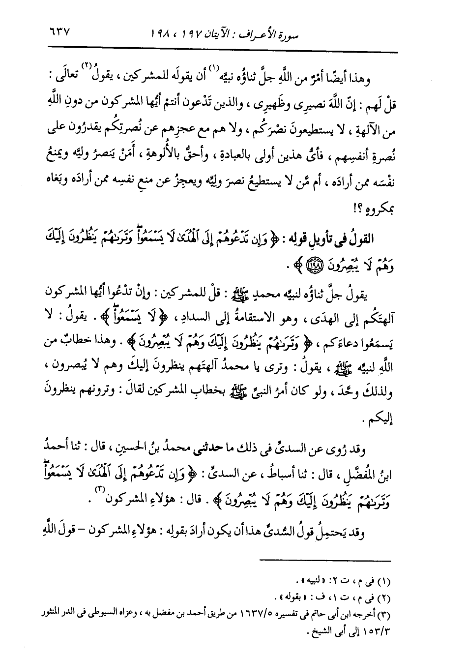 مَا: حَدَّثَنِي مُحَمَّدُ بْنُ الْحُسَيْنِ، قَالَ: ثنا أَحْمَدُ بْنُ الْمُفَضَّلِ، قَالَ: ثنا أَسْبَاطٌ، عَنِ السُّدِّيِّ: " {§وَإِنْ تَدْعُوهُمْ إِلَى الْهُدَى لَا يَسْمَعُوا وَتَرَاهُمْ يَنْظُرُونَ إِلَيْكَ وَهُمْ لَا يُبْصِرُونَ} [الأعراف: 198] قَالَ: هَؤُلَاءِ الْمُشْرِكِينَ " وَقَدْ يَحْتَمِلُ قَوْلُ السُّدِّيِّ هَذَا أَنْ يَكُونَ أَرَادَ بِقَوْلِهِ: هَؤُلَاءِ الْمُشْرِكُونَ قَوْلَ -[638]- اللَّهِ: {وَإِنْ تَدْعُوهُمْ إِلَى الْهُدَى لَا يَسْمَعُوا} [الأعراف: 198] وَقَدْ كَانَ مُجَاهِدٌ يَقُولُ فِي ذَلِكَ