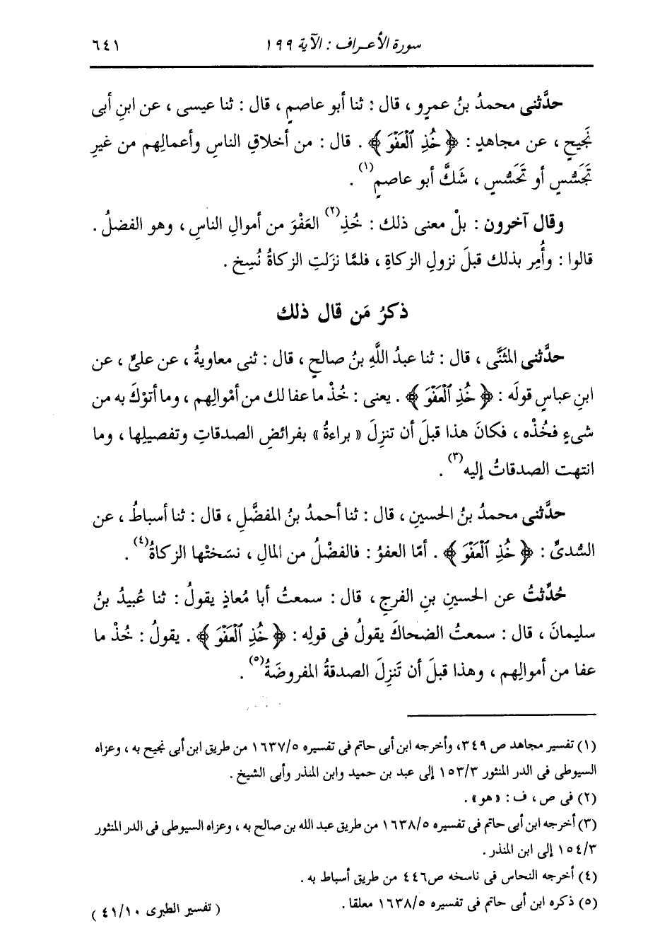 حَدَّثَنِي مُحَمَّدُ بْنُ عَمْرٍو، قَالَ: ثنا أَبُو عَاصِمٍ، قَالَهُ ثنا عِيسَى، عَنِ ابْنِ أَبِي نَجِيحٍ، عَنْ مُجَاهِدٍ: " {§خُذِ الْعَفْوَ} [الأعراف: 199] قَالَ: مِنْ أَخْلَاقِ النَّاسِ وَأَعْمَالِهِمْ مِنْ غَيْرِ تَجَسُّسٍ أَوْ تَحَسُّسٍ، شَكَّ أَبُو عَاصِمٍ " وَقَالَ آخَرُونَ: بَلْ مَعْنَى ذَلِكَ: {خُذِ الْعَفْوَ} [الأعراف: 199] مِنْ أَمْوَالِ النَّاسِ، وَهُوَ الْفَضْلُ. قَالُوا: وَأُمِرَ بِذَلِكَ قَبْلَ نُزُولِ الزَّكَاةِ، فَلَمَّا نَزَلَتِ الزَّكَاةُ نُسِخَ