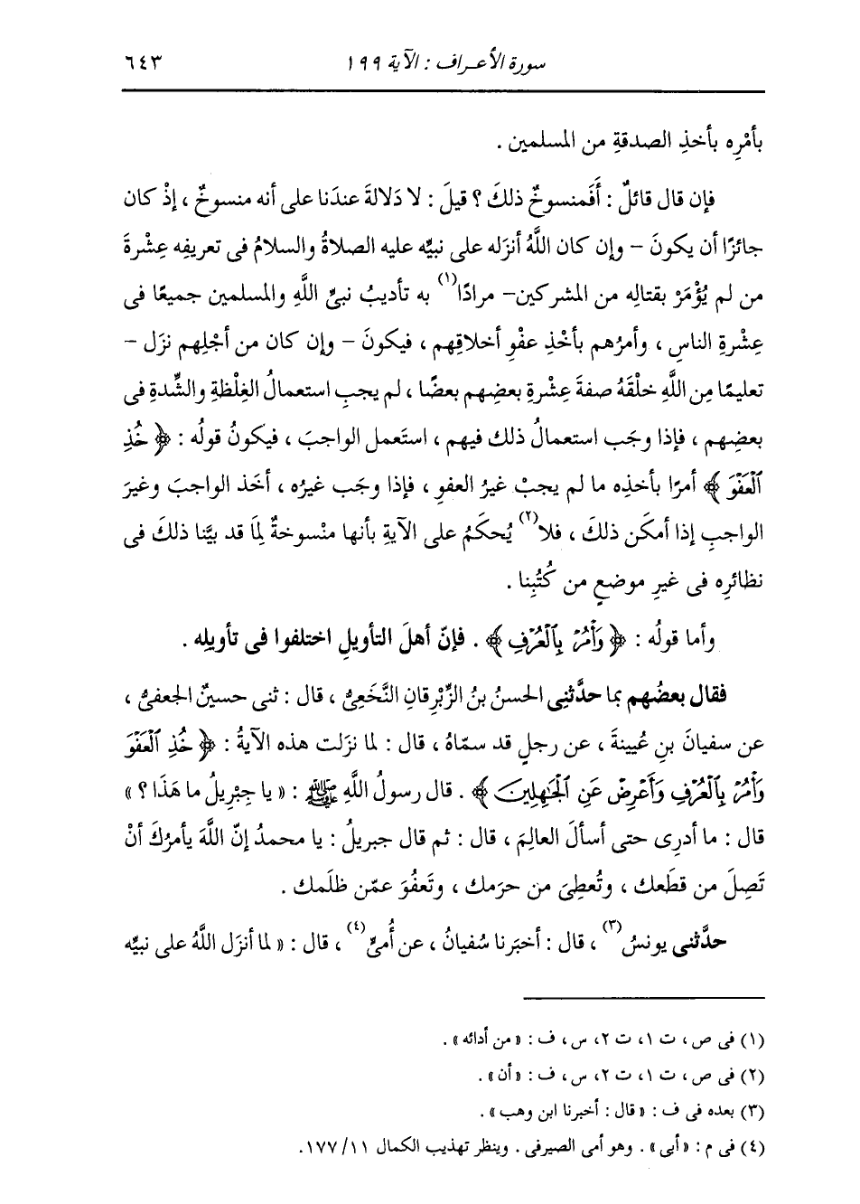 بِمَا: حَدَّثَنِي الْحَسَنُ بْنُ الزِّبْرِقَانِ النَّخَعِيُّ، قَالَ: ثني حُسَيْنٌ الْجُعْفِيُّ، عَنْ سُفْيَانَ بْنِ عُيَيْنَةَ، عَنْ رَجُلٍ، قَدْ سَمَّاهُ، قَالَ: " لَمَّا نَزَلَتْ هَذِهِ الْآيَةُ: {§خُذِ الْعَفْوَ وَأْمُرْ بِالْعُرْفِ وَأَعْرِضْ عَنِ الْجَاهِلِينَ} [الأعراف: 199] قَالَ رَسُولُ اللَّهِ صَلَّى اللهُ عَلَيْهِ وَسَلَّمَ: «يَا جِبْرِيلُ مَا هَذَا» ؟ قَالَ: مَا أَدْرِي حَتَّى أَسْأَلَ الْعَالِمَ. قَالَ: ثُمَّ قَالَ جِبْرِيلُ: يَا مُحَمَّدُ إِنَّ اللَّهَ يَأْمُرُكَ أَنْ تَصِلَ مَنْ قَطَعَكَ، وَتُعْطِيَ مَنْ حَرَمَكَ، وَتَعْفُوَ عَمَّنْ ظَلَمَكَ "