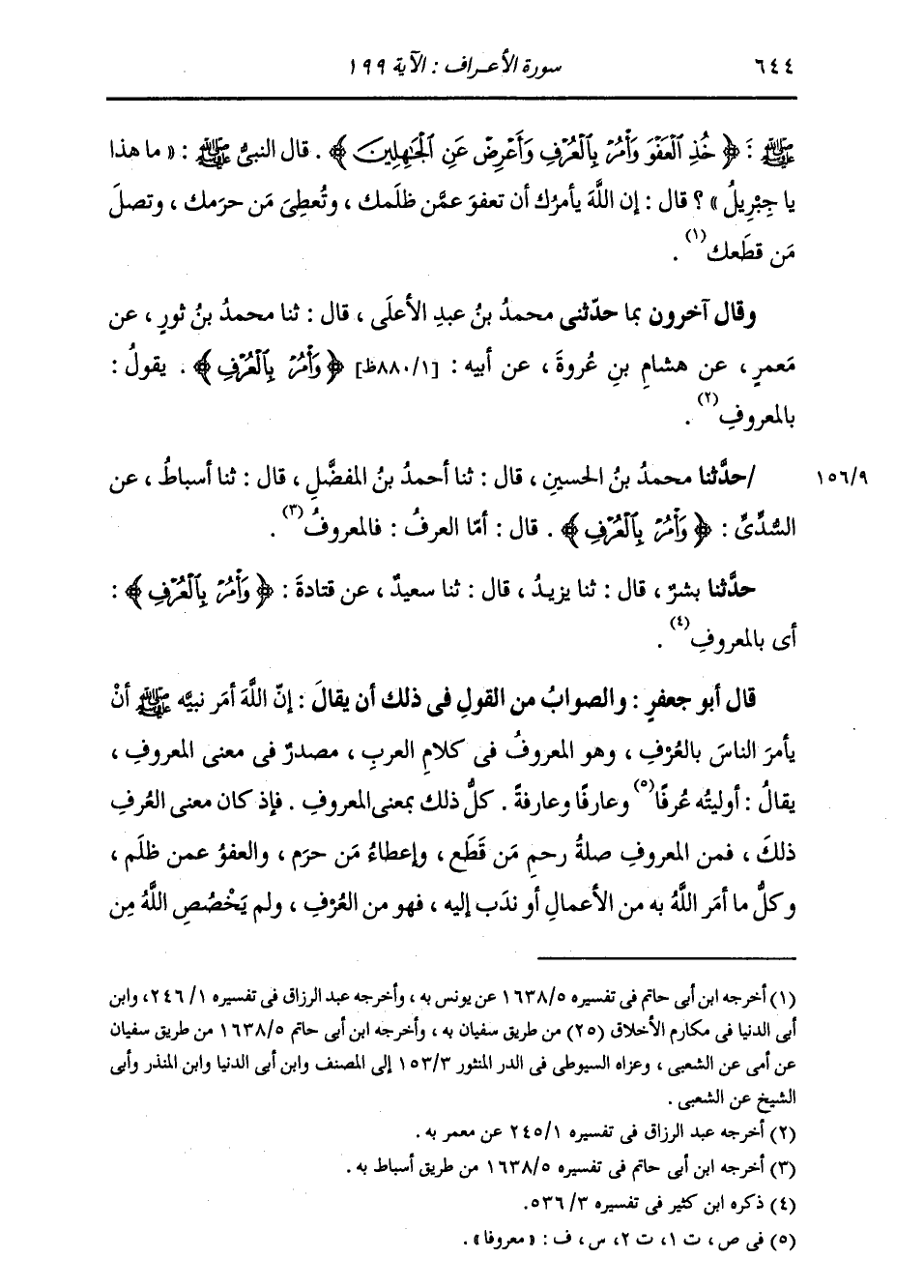 حَدَّثَنَا بِشْرٌ، قَالَ: ثنا يَزِيدُ، قَالَ: ثنا سَعِيدٌ، عَنْ قَتَادَةَ: " {§وَأْمُرْ بِالْعُرْفِ} [الأعراف: 199] أَيْ: بِالْمَعْرُوفِ " قَالَ أَبُو جَعْفَرٍ: وَالصَّوَابُ مِنَ الْقَوْلِ فِي ذَلِكَ أَنْ يُقَالَ: إِنَّ اللَّهَ أَمَرَ نَبِيَّهُ صَلَّى اللهُ عَلَيْهِ وَسَلَّمَ أَنْ يَأْمُرَ النَّاسَ بِالْعُرْفِ، وَهُوَ الْمَعْرُوفُ فِي كَلَامِ الْعَرَبِ، مَصْدَرٌ فِي مَعْنَى الْمَعْرُوفِ، يُقَالُ أَوْلَيْتُهُ عُرْفًا وَعَارِفًا وَعَارِفَةً كُلُّ ذَلِكَ بِمَعْنَى الْمَعْرُوفِ. فَإِذَا كَانَ مَعْنَى الْعُرْفِ ذَلِكَ، فَمِنَ الْمَعْرُوفِ صِلَةُ رَحِمِ مَنْ قَطَعَ، وَإِعْطَاءُ مَنْ حَرَمَ، وَالْعَفْوُ عَمَّنْ ظَلَمَ. وَكُلُّ مَا أَمَرَ اللَّهُ بِهِ مِنَ الْأَعْمَالِ أَوْ نَدَبَ إِلَيْهِ فَهُوَ مِنَ الْعُرْفِ. وَلَمْ يُخَصِّصِ اللَّهُ مِنْ -[645]- ذَلِكَ مَعْنًى دُونَ مَعْنًى، فَالْحَقُّ فِيهِ أَنْ يُقَالَ: قَدْ أَمَرَ اللَّهُ نَبِيَّهُ صَلَّى اللهُ عَلَيْهِ وَسَلَّمَ أَنْ يَأْمُرَ عِبَادَهُ بِالْمَعْرُوفِ كُلِّهِ لَا بِبَعْضِ مَعَانِيهِ دُونَ بَعْضٍ