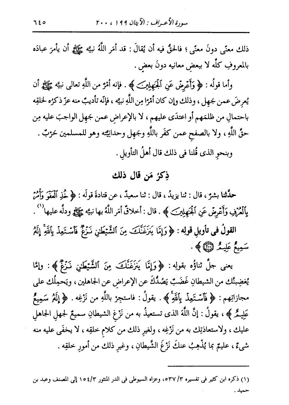 §وَأَمَّا قَوْلُهُ: {وَأَعْرِضْ عَنِ الْجَاهِلِينَ} [الأعراف: 199] فَإِنَّهُ أَمْرٌ مِنَ اللَّهِ تَعَالَى نَبِيَّهُ صَلَّى اللهُ عَلَيْهِ وَسَلَّمَ أَنْ يُعْرِضَ عَمَّنْ جَهَلَ. وَذَلِكَ وَإِنْ كَانَ أَمْرًا مِنَ اللَّهِ لِنَبِيِّهِ، فَإِنَّهُ تَأْدِيبٌ مِنْهُ عَزَّ ذِكْرُهُ لِخَلْقِهِ بِاحْتِمَالِ مَنْ ظَلَمَهُمْ أَوِ اعْتَدَى عَلَيْهِمْ، لَا بِالْإِعْرَاضِ عَمَّنْ جَهَلَ الْوَاجِبَ عَلَيْهِ مِنْ حَقِّ اللَّهِ وَلَا بِالصَّفْحِ عَمَّنْ كَفَرَ بِاللَّهِ وَجَهَلَ وَحْدَانِيَّتَهُ، وَهُوَ لِلْمُسْلِمِينَ حَرْبٌ. وَبِنَحْوِ الَّذِي قُلْنَا فِي ذَلِكَ قَالَ أَهْلُ التَّأْوِيلِ