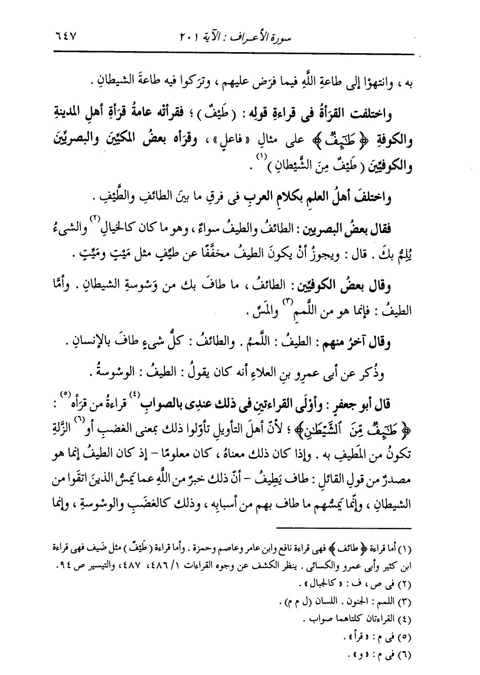 بِهِ، وَانْتَهَوْا إِلَى طَاعَةِ اللَّهِ فِيمَا فَرَضَ عَلَيْهِمْ وَتَرَكُوا فِيهِ طَاعَةَ الشَّيْطَانِ. وَاخْتَلَفَتِ الْقُرَّاءُ فِي قِرَاءَةِ قَوْلِهِ: (طَيْفٌ) فَقَرَأَتْهُ عَامَّةُ قُرَّاءِ أَهْلِ الْمَدِينَةِ وَالْكُوفَةِ: {طَائِفٌ} [الأعراف: 201] عَلَى مِثَالِ فَاعِلٍ، وَقَرَأَهُ بَعْضُ الْمَكِّيِّينَ وَالْبَصْرِيِّينَ وَالْكُوفِيِّينَ: (طَيْفٌ مِنَ الشَّيْطَانِ) وَاخْتَلَفَ أَهْلُ الْعِلْمِ بِكَلَامِ الْعَرَبِ فِي فَرْقِ مَا بَيْنَ الطَّائِفِ وَالطَّيْفِ. قَالَ بَعْضُ الْبَصْرِيِّينَ: الطَّائِفُ وَالطَّيْفُ سَوَاءٌ، وَهُوَ مَا كَانَ كَالْخَيَالِ وَالشَّيْءِ يَلِمُّ بِكَ. قَالَ: وَيَجُوزُ أَنْ يَكُونَ الطَّيْفُ مُخَفَّفًا عَنْ طَيِّفٍ مِثْلُ مَيِّتٍ وَمَيْتٍ. وَقَالَ بَعْضُ الْكُوفِيِّينَ: الطَّائِفُ: مَا طَافَ بِكَ مِنْ وَسْوَسَةِ الشَّيْطَانِ، وَأَمَّا الطَّيْفُ: فَإِنَّمَا هُوَ مِنَ اللِّمَمِ وَالْمَسِّ. وَقَالَ آخَرٌ مِنْهُمُ: الطَّيْفُ: اللِّمَمُ، وَالطَّائِفُ: كُلُّ شَيْءٍ طَافَ بِالْإِنْسَانِ. وَذُكِرَ عَنْ أَبِي عَمْرِو بْنِ الْعَلَاءِ أَنَّهُ كَانَ يَقُولُ: الطَّيْفُ: الْوَسْوَسَةُ. قَالَ أَبُو جَعْفَرٍ: وَأَوْلَى الْقِرَاءَتَيْنِ فِي ذَلِكَ عِنْدِي بِالصَّوَابِ قِرَاءَةُ مَنْ قَرَأَ: {طَائِفٌ مِنَ الشَّيْطَانِ} [الأعراف: 201] لِأَنَّ أَهْلَ التَّأْوِيلِ تَأَوَّلُوا ذَلِكَ بِمَعْنَى الْغَضَبِ وَالزَّلَّةِ تَكُونُ مِنَ الْمَطِيفِ بِهِ. وَإِذَا كَانَ ذَلِكَ مَعْنَاهُ كَانَ مَعْلُومًا إِذْ كَانَ الطَّيْفُ إِنَّمَا هُوَ مَصْدَرٌ مِنْ قَوْلِ الْقَائِلِ: طَافَ يَطِيفُ، أَنَّ ذَلِكَ خَبَرٌ مِنَ اللَّهِ عَمَّا يَمَسُّ الَّذِينَ اتَّقَوْا مِنَ الشَّيْطَانِ، وَإِنَّمَا يَمَسُّهُمْ مَا طَافَ بِهِمْ مِنْ أَسْبَابِهِ، وَذَلِكَ كَالْغَضَبِ وَالْوَسْوَسَةِ. وَإِنَّمَا