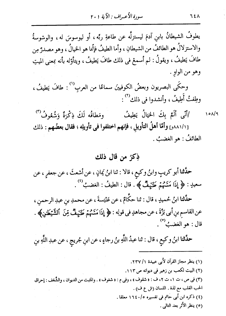 ذِكْرُ مَنْ قَالَ ذَلِكَ: حَدَّثَنَا أَبُو كُرَيْبٍ، وَابْنُ وَكِيعٍ، قَالَا: ثنا ابْنُ يَمَانٍ، عَنْ أَشْعَثَ، عَنْ جَعْفَرٍ، عَنْ سَعِيدٍ: " {§إِذَا مَسَّهُمْ طَائِفٌ} [الأعراف: 201] قَالَ: الطَّيْفُ: الْغَضَبُ "