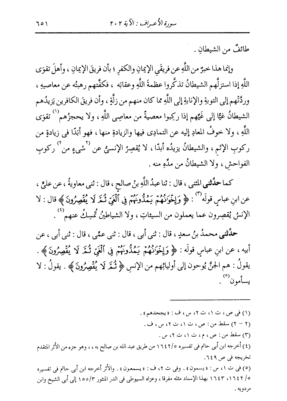 كَمَا حَدَّثَنِي الْمُثَنَّى، قَالَ: ثنا عَبْدُ اللَّهِ بْنُ صَالِحٍ، قَالَ: ثني مُعَاوِيَةُ، عَنْ عَلِيٍّ، عَنِ ابْنِ عَبَّاسٍ: " {§وَإِخْوَانُهُمْ يَمُدُّونَهُمْ فِي الْغَيِّ ثُمَّ لَا يُقْصِرُونَ} [الأعراف: 202] قَالَ: لَا الْإِنْسُ يُقْصِرُونَ عَمَّا يَعْمَلُونَ مِنَ السَّيِّئَاتِ، وَلَا الشَّيَاطِينُ تُمْسِكُ عَنْهُمْ "