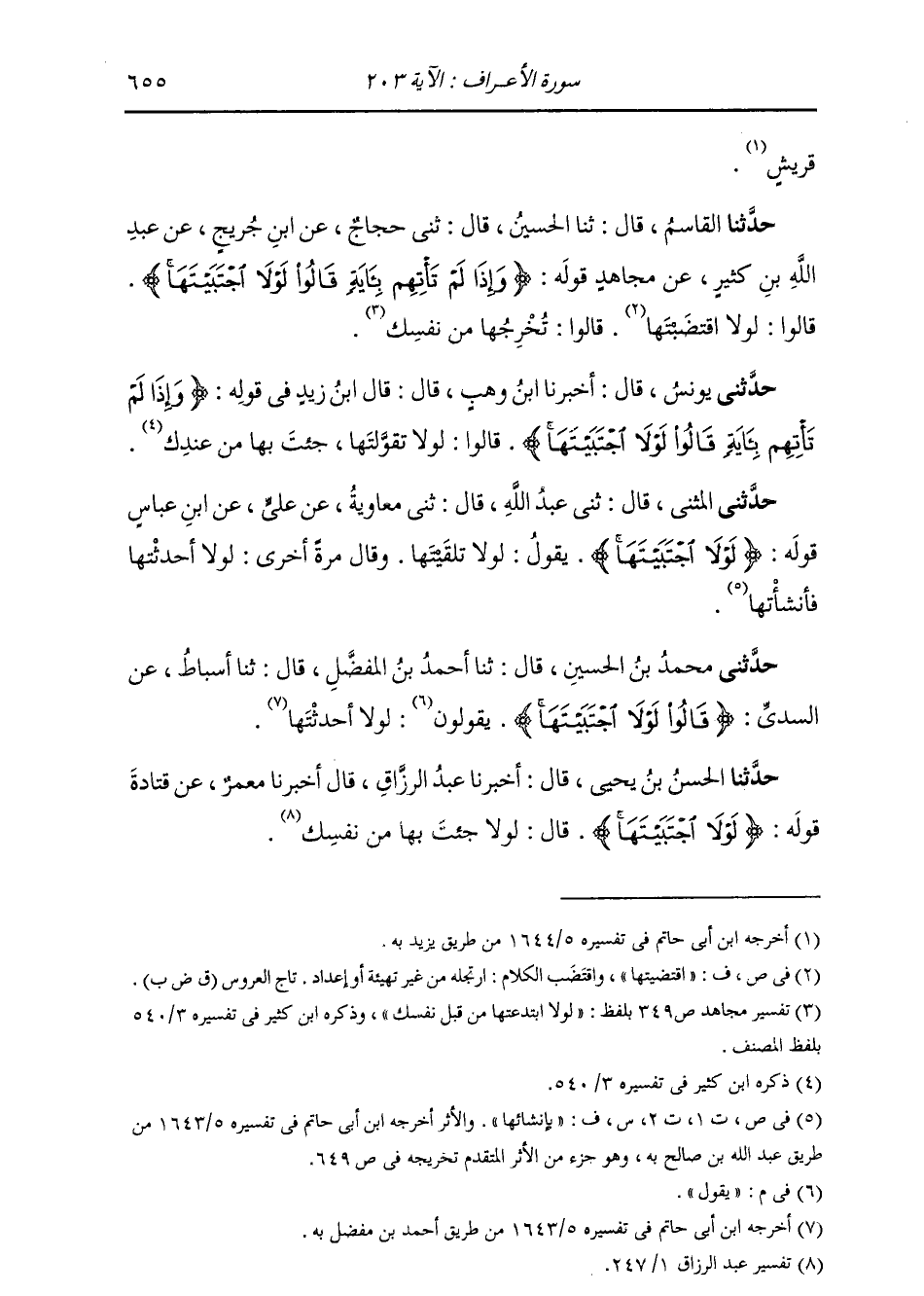 حَدَّثَنَا الْقَاسِمُ، قَالَ: ثنا الْحُسَيْنُ، قَالَ: ثني حَجَّاجٌ، عَنِ ابْنِ جُرَيْجٍ، عَنْ عَبْدِ اللَّهِ بْنِ كَثِيرٍ، عَنْ مُجَاهِدٍ، قَوْلُهُ: " {§وَإِذَا لَمْ تَأْتِهِمْ بِآيَةٍ قَالُوا لَوْلَا اجْتَبَيْتَهَا} [الأعراف: 203] قَالُوا: لَوْلَا اقْتَضَبْتَهَا قَالُوا: تُخْرِجُهَا مِنْ نَفْسِكِ "