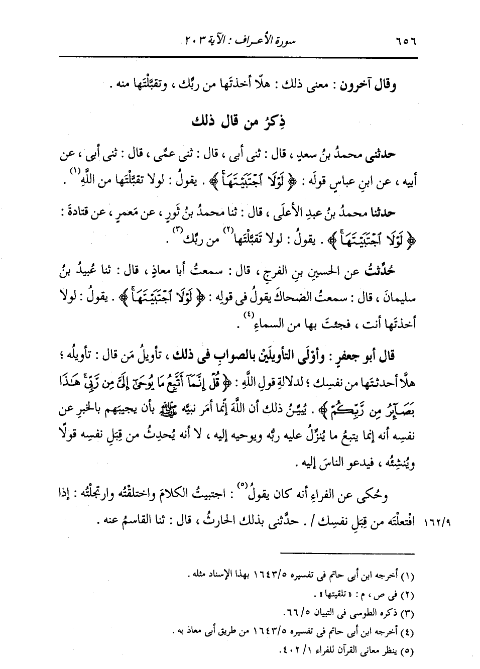 حُدِّثْتُ عَنِ الْحُسَيْنِ بْنِ الْفَرَجِ، قَالَ: سَمِعْتُ أَبَا مُعَاذٍ، قَالَ: ثنا عُبَيْدُ بْنُ سُلَيْمَانَ، قَالَ: سَمِعْتُ الضَّحَّاكَ، يَقُولُ فِي قَوْلِهِ: " {§لَوْلَا اجْتَبَيْتَهَا} [الأعراف: 203] يَقُولُ: لَوْلَا أَخَذْتَهَا أَنْتَ فَجِئْتَ بِهَا مِنَ السَّمَاءِ " قَالَ أَبُو جَعْفَرٍ: وَأَوْلَى التَّأْوِيلَيْنِ بِالصَّوَابِ فِي ذَلِكَ، تَأْوِيلُ مَنْ قَالَ تَأْوِيلُهُ: هَلَّا أَحْدَثْتَهَا مِنْ نَفْسِكِ، لِدَلَالَةِ قَوْلِ اللَّهِ: {قُلْ إِنَّمَا أَتَّبِعُ مَا يُوحَى إِلَيَّ مِنْ رَبِّي هَذَا بَصَائِرُ مِنْ رَبِّكُمْ} [الأعراف: 203] يُبَيِّنُ ذَلِكَ أَنَّ اللَّهَ إِنَّمَا أَمَرَ نَبِيَّهُ صَلَّى اللهُ عَلَيْهِ وَسَلَّمَ بِأَنْ يُجِيبَهُمْ بِالْخَبَرِ عَنْ نَفْسِهِ أَنَّهُ إِنَّمَا يَتَّبِعُ مَا يُنَزِّلُ عَلَيْهِ رَبُّهُ وَيُوحِيهِ إِلَيْهِ، لَا أَنَّهُ يُحَدِّثُ مِنْ قِبَلِ نَفْسِهِ قَوْلًا وَيُنْشِئُهُ فَيَدْعُو النَّاسَ إِلَيْهِ