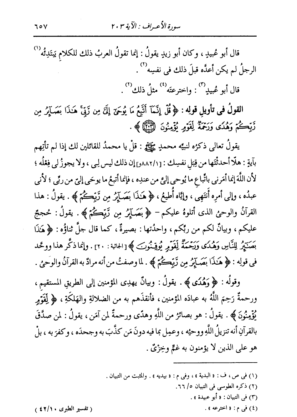 §الْقَوْلُ فِي تَأْوِيلِ قَوْلِهِ تَعَالَى: {قُلْ إِنَّمَا أَتَّبِعُ مَا يُوحَى إِلَيَّ مِن رَّبِّي هَذَا بَصَائِرُ مِنْ رَّبِّكُمْ وَهَدًى وَرَحْمَةٌ لِقَوْمٍ يُؤْمِنُونَ} [الأعراف: 203] يَقُولُ تَعَالَى ذِكْرُهُ لِنَبِيِّهِ مُحَمَّدٍ صَلَّى اللهُ عَلَيْهِ وَسَلَّمَ: قُلْ يَا مُحَمَّدُ لِلْقَائِلِينَ لَكَ إِذَا لَمْ تَأْتِهِمْ بِآيَةٍ هَلَّا أَحْدَثْتَهَا مِنْ قِبَلِ نَفْسِكَ: إِنَّ ذَلِكَ لَيْسَ لِي وَلَا يَجُوزُ لِي فَعَلُهُ لِأَنَّ اللَّهَ إِنَّمَا أَمَرَنِي بِاتِّبَاعِ مَا يُوحَى إِلَيَّ مِنْ عِنْدِهِ، فَإِنَّمَا أَتَّبِعُ مَا يُوحَى إِلَيَّ مِنْ رَبِّي لِأَنِّي عَبْدُهُ وَإِلَى أَمْرِهِ أَنْتَهِي وَإِيَّاهُ أُطِيعُ. {هَذَا بَصَائِرُ مِنْ رَبِّكُمْ} [الأعراف: 203] يَقُولُ: هَذَا الْقُرْآنُ وَالْوَحْي الَّذِي أَتْلُوَهُ عَلَيْكُمْ بَصَائِرُ مِنْ رَبِّكُمْ، يَقُولُ: حُجَجٌ عَلَيْكُمْ، وَبَيَانٌ لَكُمْ مِنْ رَبِّكُمْ، وَاحِدَتُهَا: بَصِيرَةٌ، كَمَا قَالَ جَلَّ ثَنَاؤُهُ: {هَذَا بَصَائِرُ لِلنَّاسِ وَهَدًى وَرَحْمَةٌ لِقَوْمٍ يُؤْمِنُونَ} وَإِنَّمَا ذَكَرَ هَذَا وَوَحَّدَ فِي قَوْلِهِ: {هَذَا بَصَائِرُ مِنْ رَبِّكُمْ} [الأعراف: 203] لِمَا وَصَفْتُ مِنْ أَنَّهُ مُرَادٌ بِهِ الْقُرْآنُ وَالْوَحْي. وَقَوْلُهُ: {وَهَدًى} [البقرة: 97] يَقُولُ: وَبَيَانٌ يَهْدِي الْمُؤْمِنِينَ إِلَى الطَّرِيقِ الْمُسْتَقِيمِ، وَرَحْمَةٌ رَحِمَ اللَّهُ بِهِ عِبَادَهُ الْمُؤْمِنِينَ، فَأَنْقَذَهُمْ بِهِ مِنَ الضَّلَالَةِ وَالْهَلَكَةِ. {لِقَوْمٍ يُؤْمِنُونَ} [الأنعام: 99] يَقُولُ: هُوَ بَصَائِرُ مِنَ اللَّهِ وَهَدًى وَرَحْمَةٌ لِمَنْ آمَنَ، يَقُولُ: لِمَنْ صَدَّقَ بِالْقُرْآنِ أَنَّهُ تَنْزِيلُ اللَّهِ وَوَحْيُهُ، وَعَمِلَ بِمَا فِيهِ دُونَ مَنْ كَذَّبَ بِهِ وَجَحَدَهُ وَكَفَرَ بِهِ، بَلْ هُوَ عَلَى الَّذِينَ لَا يُؤْمِنُونَ بِهِ غُمٌّ وَخِزْي