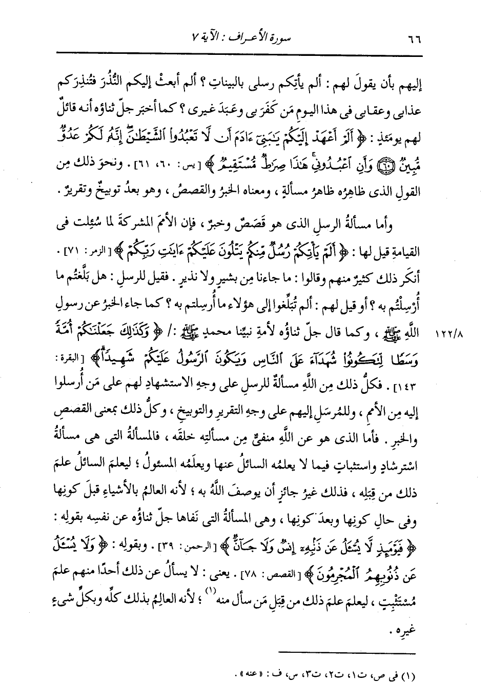 إِلَيْهِمْ بِأَنْ يَقُولَ لَهُمْ: أَلَمْ يَأْتِكُمْ رُسُلِي بِالْبَيِّنَاتِ؟ أَلَمْ أَبْعَثْ إِلَيْكُمُ النُّذُرَ فَتُنْذِرَكُمْ عَذَابِي وَعِقَابِي فِي هَذَا الْيَوْمِ مَنْ كَفَرَ بِي وَعَبَدَ غَيْرِي؟ كَمَا أَخْبَرَ جَلَّ ثَنَاؤُهُ أَنَّهُ قَائِلٌ لَهُمْ يَوْمَئِذٍ: {أَلَمْ أَعْهَدْ إِلَيْكُمْ يَا بَنِي آدَمَ أَنْ لَا تَعْبُدُوا الشَّيْطَانَ إِنَّهُ لَكُمْ عَدُوٌّ مُبِينٌ. وَأَنِ اعْبُدُونِي هَذَا صِرَاطٌ مُسْتَقِيمٌ} [يس: 61] . وَنَحْوَ ذَلِكَ مِنَ الْقَوْلِ الَّذِي ظَاهِرُهُ ظَاهِرُ مَسْأَلَةٍ، وَمَعْنَاهُ الْخَبَرُ وَالْقَصَصُ وَهُوَ بَعْدُ تَوْبِيخٌ وَتَقْرِيرٌ. وَأَمَّا مَسْأَلَةُ الرُّسُلِ الَّذِي هُوَ قَصَصٌ وَخَبَرٌ، فَإِنَّ الْأُمَمَ الْمُشْرِكَةَ لَمَّا سُئِلَتْ فِي الْقِيَامَةِ قِيلَ لَهَا: {أَلَمْ يَأْتِكُمْ رُسُلٌ مِنْكُمْ يَتْلُونَ عَلَيْكُمْ آيَاتِ رَبِّكُمْ} [الزمر: 71] ؟ أَنْكَرَ ذَلِكَ كَثِيرٌ مِنْهُمْ وَقَالُوا: مَا جَاءَنَا مِنْ بَشِيرٍ وَلَا نَذِيرٍ، فَقِيلَ لِلرُّسُلِ: هَلْ بَلَّغْتُمْ مَا أُرْسِلْتُمْ بِهِ؟ أَوْ قِيلَ لَهُمْ: أَلَمْ تُبَلِّغُوا إِلَى هَؤُلَاءِ مَا أُرْسِلْتُمْ بِهِ؟ كَمَا جَاءَ الْخَبَرُ عَنْ رَسُولِ اللَّهِ صَلَّى اللهُ عَلَيْهِ وَسَلَّمَ، وَكَمَا قَالَ جَلَّ ثَنَاؤُهُ لِأُمَّةِ نَبِيِّنَا مُحَمَّدٍ صَلَّى اللهُ عَلَيْهِ وَسَلَّمَ: {وَكَذَلِكَ جَعَلْنَاكُمْ أُمَّةً وَسَطًا لِتَكُونُوا شُهَدَاءَ عَلَى النَّاسِ وَيَكُونَ الرَّسُولُ عَلَيْكُمْ شَهِيدًا} [البقرة: 143] ، فَكُلُّ ذَلِكَ مِنَ اللَّهِ مَسْأَلَةٌ لِلرُّسُلِ عَلَى وَجْهِ الِاسْتِشْهَادِ لَهُمْ عَلَى مَنْ أُرْسِلُوا إِلَيْهِ مِنَ الْأُمَمِ وَلِلْمُرْسَلِ إِلَيْهِمْ عَلَى وَجْهِ التَّقْرِيرِ وَالتَّوْبِيخِ، وَكُلُّ ذَلِكَ بِمَعْنَى الْقَصَصِ وَالْخَبَرِ. فَأَمَّا الَّذِي هُوَ عَنِ اللَّهِ مَنْفِيُّ مِنْ مَسْأَلَتِهِ خَلْقَهُ، فَالْمَسْأَلَةُ الَّتِي هِيَ مَسْأَلَةُ اسْتِرْشَادٍ وَاسْتِثْبَاتٍ فِيمَا لَا يَعْلَمُهُ السَّائِلُ عَنْهَا وَيَعْلَمُهُ الْمَسْئُولُ، لِيَعْلَمَ السَّائِلُ عِلْمَ ذَلِكَ مِنْ قِبَلِهِ. فَذَلِكَ غَيْرُ جَائِزٍ أَنْ يُوصَفَ اللَّهُ بِهِ، لِأَنَّهُ الْعَالِمُ بِالْأَشْيَاءِ قَبْلَ كَوْنِهَا وَفِي حَالِ كَوْنِهَا وَبَعْدَ كَوْنِهَا، وَهِيَ الْمَسْأَلَةُ الَّتِي نَفَاهَا جَلَّ ثَنَاؤُهُ عَنْ نَفْسِهِ بِقَوْلِهِ: {فَيَوْمَئِذٍ لَا يُسْأَلُ عَنْ ذَنْبِهِ إِنْسٌ وَلَا جَانٌّ} [الرحمن: 39] ، وَبِقَوْلِهِ: {وَلَا يُسْأَلُ عَنْ ذُنُوبِهِمُ الْمُجْرِمُونَ} [القصص: 78] ، يَعْنِي: لَا يَسْأَلُ عَنْ ذَلِكَ أَحَدًا مِنْهُمْ عِلْمَ مُسْتَثْبِتٍ، لِيَعْلَمَ عِلْمَ ذَلِكَ مِنْ قِبَلِ مَنْ سَأَلَ مِنْهُ، لِأَنَّهُ الْعَالِمُ بِذَلِكَ كُلِّهِ وَبِكُلِّ شَيْءٍ غَيْرِهِ.