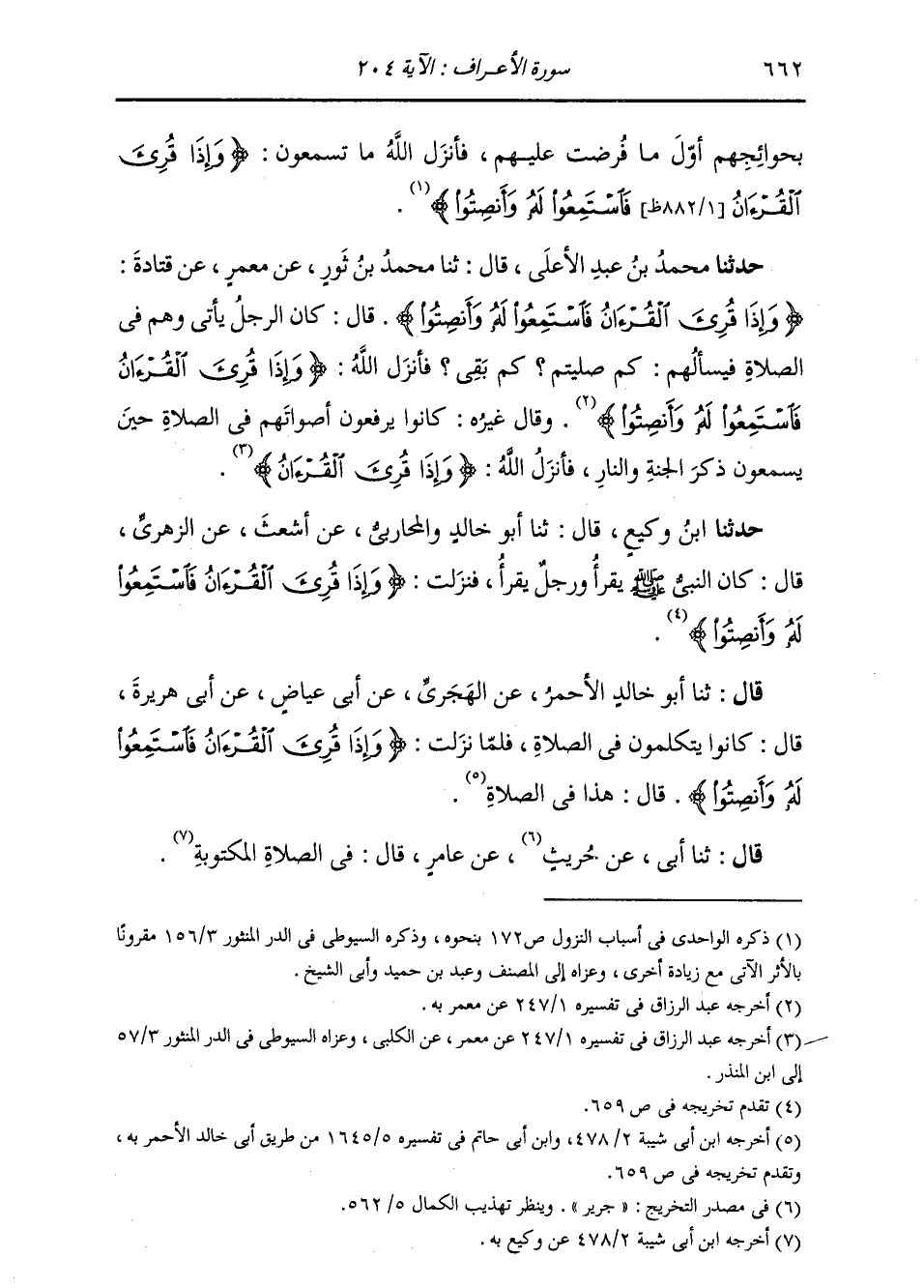 قَالَ: ثنا أَبُو خَالِدٍ الْأَحْمَرُ، عَنِ الْهَجَرِيِّ، عَنْ أَبِي عِيَاضٍ، عَنْ أَبِي هُرَيْرَةَ، قَالَ: " §كَانُوا يَتَكَلَّمُونَ فِي الصَّلَاةِ، فَلَمَّا نَزَلَتْ: {وَإِذَا قُرِئَ الْقُرْآنُ فَاسْتَمِعُوا لَهُ وَأَنْصِتُوا} [الأعراف: 204] قَالَ: هَذَا فِي الصَّلَاةِ "