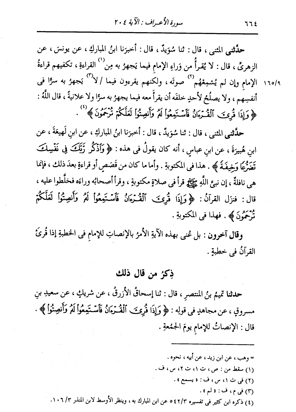 حَدَّثَنِي الْمُثَنَّى، قَالَ: ثنا سُوَيْدٌ، قَالَ: أَخْبَرَنَا ابْنُ الْمُبَارَكِ، عَنِ ابْنِ لَهِيعَةَ، عَنِ ابْنِ هُبَيْرَةَ، عَنِ ابْنِ عَبَّاسٍ، أَنَّهُ كَانَ يَقُولُ فِي هَذِهِ: " {§وَاذْكُرْ رَبَّكَ فِي نَفْسِكَ تَضَرُّعًا وَخِيفَةً} [الأعراف: 205] هَذَا فِي الْمَكْتُوبَةِ. وَأَمَّا مَا كَانَ مِنْ قَصَصٍ أَوْ قِرَاءَةٍ بَعْدَ ذَلِكَ، فَإِنَّمَا هِيَ نَافِلَةٌ. إِنَّ نَبِيَّ اللَّهِ صَلَّى اللهُ عَلَيْهِ وَسَلَّمَ قَرَأَ فِي صَلَاةٍ مَكْتُوبَةٍ، وَقَرَأَ وَرَاءَهُ أَصْحَابُهُ، فَخَلَّطُوا عَلَيْهِ، قَالَ: فَنَزَلَ الْقُرْآنُ: {وَإِذَا قُرِئَ الْقُرْآنُ فَاسْتَمِعُوا لَهُ وَأَنْصِتُوا لَعَلَّكُمْ تُرْحَمُونَ} [الأعراف: 204] فَهَذَا فِي الْمَكْتُوبَةِ " وَقَالَ آخَرُونَ: بَلْ عُنِيَ بِهَذِهِ الْآيَةِ الْأَمْرُ بِالْإِنْصَاتِ لِلْإِمَامِ فِي الْخُطْبَةِ إِذَا قُرِئَ الْقُرْآنُ فِي خُطْبَةٍ