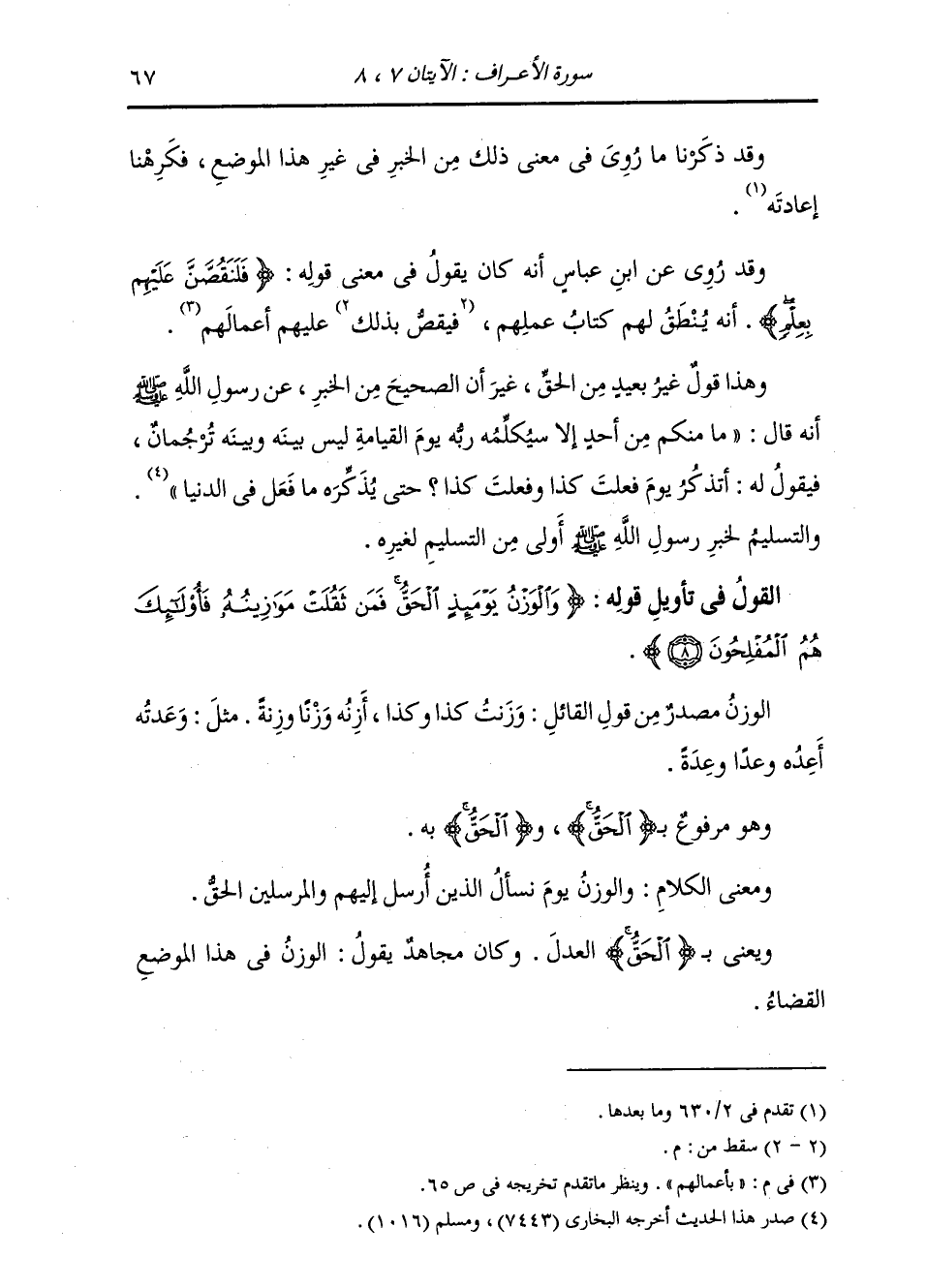 §الْقَوْلُ فِي تَأْوِيلِ قَوْلِهِ تَعَالَى: {وَالْوَزْنُ يَوْمَئِذٍ الْحَقُّ فَمَنْ ثَقُلَتْ مَوَازِينُهُ فَأُولَئِكَ هُمُ الْمُفْلِحُونَ} [الأعراف: 8] " الْوَزْنُ: مَصْدَرٌ مِنْ قَوْلِ الْقَائِلِ: وَزَنْتُ كَذَا وَكَذَا، أَزِنُهُ وَزْنًا وَزِنَةً، مِثْلُ: وَعَدْتُهُ أَعِدُهُ وَعْدًا وَعِدَةً، وَهُوَ مَرْفُوعٌ بِالْحَقِّ، وَالْحَقُّ بِهِ. وَمَعْنَى الْكَلَامِ: وَالْوَزْنُ يَوْمَ نَسْأَلُ الَّذِينَ أُرْسِلَ إِلَيْهِمْ وَالْمُرْسَلِينَ، الْحَقُّ. وَيَعْنِي بِالْحَقِّ: الْعَدْلَ. وَكَانَ مُجَاهِدٌ يَقُولُ: " الْوَزْنُ فِي هَذَا الْمَوْضِعِ: الْقَضَاءُ "