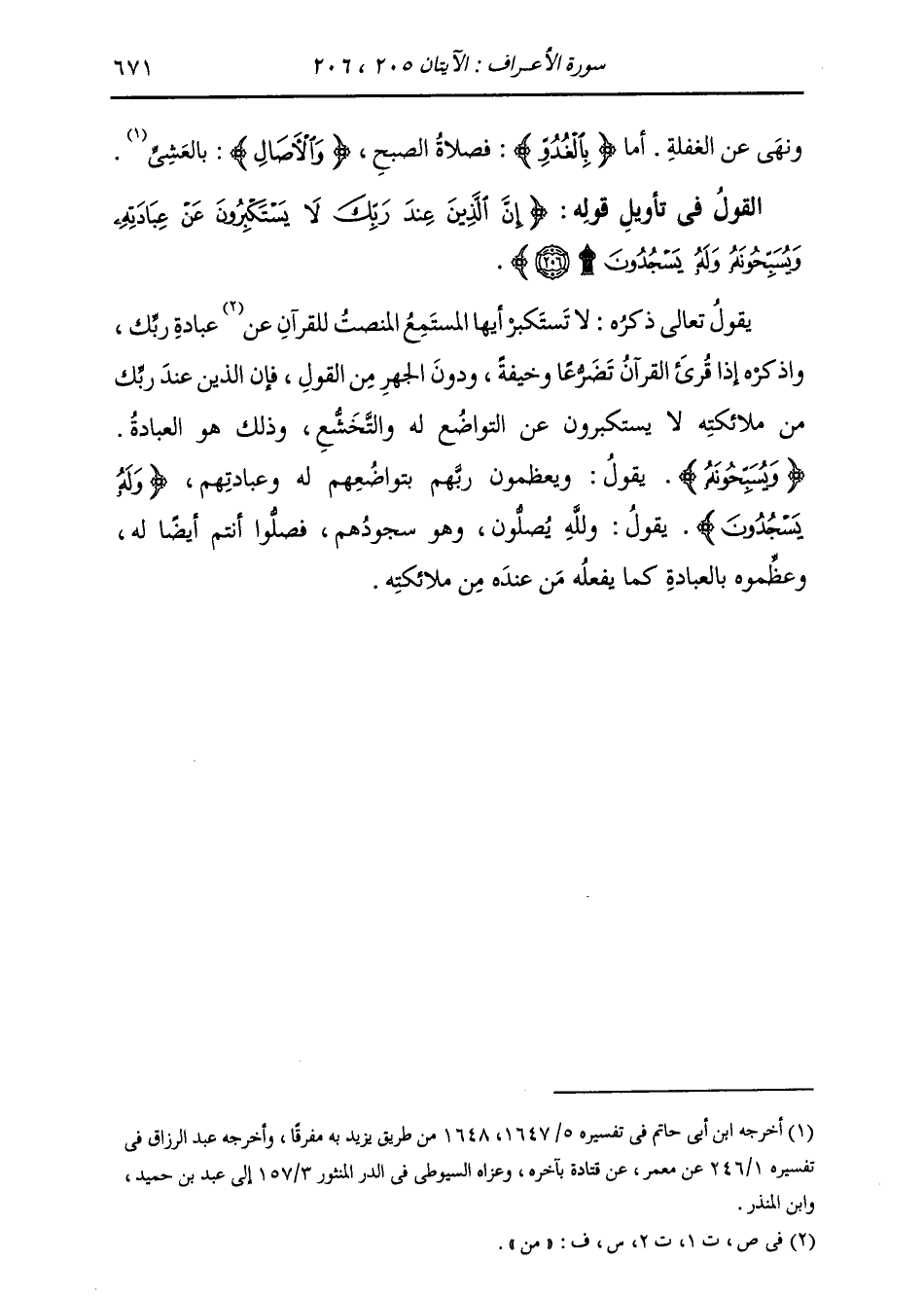 §الْقَوْلُ فِي تَأْوِيلِ قَوْلِهِ تَعَالَى: {إِنَّ الَّذِينَ عِنْدَ رَبِّكَ لَا يَسْتَكْبِرُونَ عَنْ عِبَادَتِهِ وَيُسَبِّحُونَهُ وَلَهُ يَسْجُدُونَ} [الأعراف: 206] يَقُولُ تَعَالَى ذِكْرُهُ: لَا تَسْتَكْبِرُ أَيُّهَا الْمُسْتَمِعُ الْمُنْصِتُ لِلْقُرْآنِ عَنْ عِبَادَةِ رَبِّكَ، وَاذْكُرْهُ إِذَا قُرِئَ الْقُرْآنُ تَضَرُّعًا وَخِيفَةً وَدُونَ الْجَهْرِ مِنَ الْقَوْلِ، فَإِنَّ الَّذِينَ عِنْدَ رَبِّكَ مِنْ مَلَائِكَتِهِ لَا يَسْتَكْبِرُونَ عَنِ التَّوَاضُعِ لَهُ وَالتَّخَشُّعِ، وَذَلِكَ هُوَ الْعِبَادَةُ