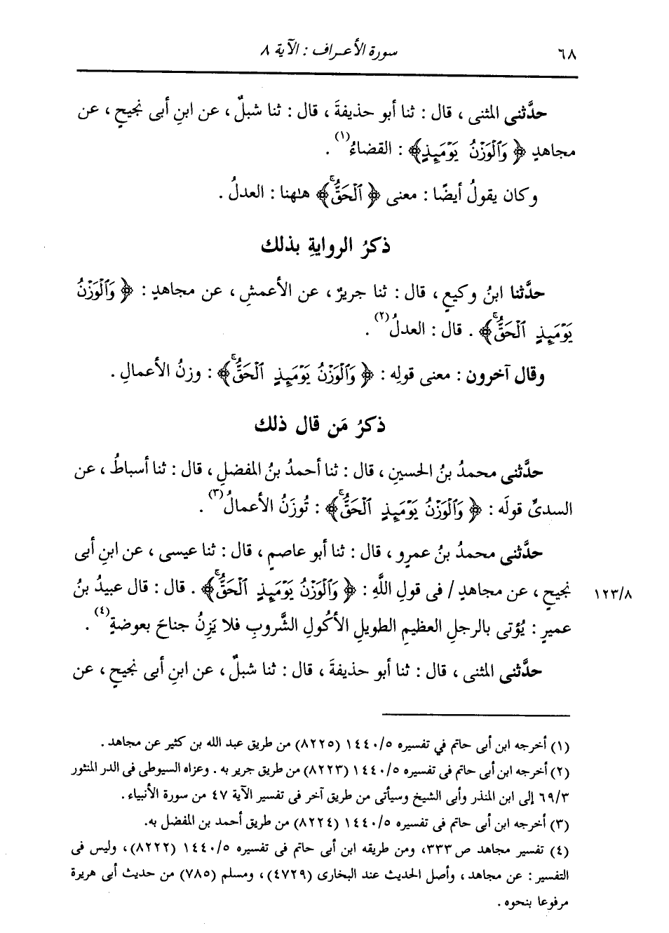 حَدَّثَنِي الْمُثَنَّى، قَالَ: ثنا أَبُو حُذَيْفَةَ، قَالَ: ثنا شِبْلٌ، عَنِ ابْنِ أَبِي نَجِيحٍ، عَنْ مُجَاهِدٍ: {§وَالْوَزْنُ يَوْمَئِذٍ} [الأعراف: 8] : «الْقَضَاءُ» وَكَانَ يَقُولُ أَيْضًا: مَعْنَى الْحَقِّ هَهُنَا: الْعَدْلُ