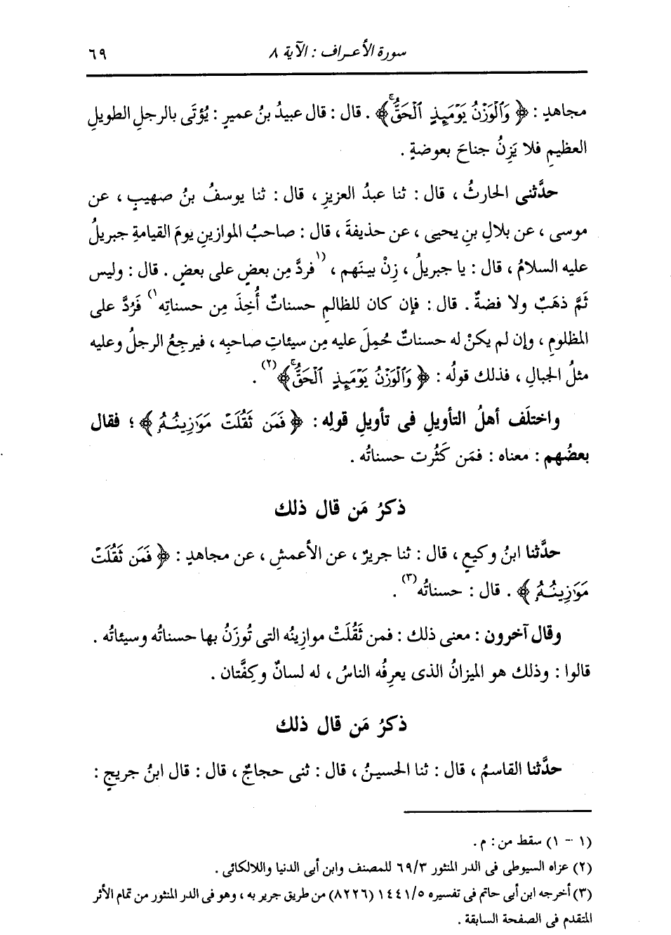 ذِكْرُ مَنْ قَالَ ذَلِكَ حَدَّثَنَا الْقَاسِمُ، قَالَ: ثنا الْحُسَيْنُ، قَالَ: ثني حَجَّاجٌ قَالَ: قَالَ ابْنُ جُرَيْجٍ: -[70]- قَالَ لِي عَمْرُو بْنُ دِينَارٍ: قَوْلُهُ: {§وَالْوَزْنُ يَوْمَئِذٍ الْحَقُّ} [الأعراف: 8] قَالَ: «إِنَّا نَرَى مِيزَانًا وَكِفَّتَيْنِ»
