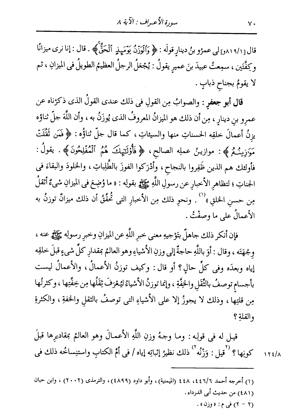 سَمِعْتُ عُبَيْدَ بْنَ عُمَيْرٍ يَقُولُ: «§يُجْعَلُ الرَّجُلُ الْعَظِيمُ الطَّوِيلُ فِي الْمِيزَانِ، ثُمَّ لَا يَقُومُ بِجَنَاحٍ ذُبَابٍ» قَالَ أَبُو جَعْفَرٍ: وَالصَّوَابُ مِنَ الْقَوْلِ فِي ذَلِكَ عِنْدِي الْقَوْلُ الَّذِي ذَكَرْنَاهُ عَنْ عَمْرِو بْنِ دِينَارٍ مِنْ أَنَّ ذَلِكَ: هُوَ الْمِيزَانُ الْمَعْرُوفُ الَّذِي يُوزَنُ بِهِ، وَأَنَّ اللَّهَ جَلَّ ثَنَاؤُهُ يَزِنُ أَعْمَالَ خَلْقِهِ الْحَسَنَاتِ مِنْهَا وَالسَّيِّئَاتِ، كَمَا قَالَ جَلَّ ثَنَاؤُهُ: {فَمَنْ ثَقُلَتْ مَوَازِينُهُ} [الأعراف: 8] : مَوَازِينُ عَمَلِهِ الصَّالِحِ، {فَأُولَئِكَ هُمُ الْمُفْلِحُونَ} [الأعراف: 8] يَقُولُ: فَأُولَئِكَ هُمُ الَّذِينَ ظَفَرُوا بِالنَّجَاحِ وَأَدْرَكُوا الْفَوْزَ بِالطَّلَبَاتِ، وَالْخُلُودِ وَالْبَقَاءِ فِي الْجَنَّاتِ، لِتَظَاهُرِ الْأَخْبَارِ عَنْ رَسُولِ اللَّهِ صَلَّى اللهُ عَلَيْهِ وَسَلَّمَ بِقَوْلِهِ: «مَا وُضِعَ فِي الْمِيزَانِ شَيْءٌ أَثْقَلَ مِنْ حُسْنِ الْخُلُقِ» ، وَنَحْوِ ذَلِكَ مِنَ الْأَخْبَارِ الَّتِي تُحَقِّقُ أَنَّ ذَلِكَ مِيزَانٌ يُوزَنُ بِهِ الْأَعْمَالُ عَلَى مَا وَصَفْتُ. فَإِنْ أَنْكَرَ ذَلِكَ جَاهِلٌ بِتَوْجِيهِ مَعْنَى خَبَرِ اللَّهِ عَنِ الْمِيزَانِ وَخَبَرِ رَسُولِهِ صَلَّى اللهُ عَلَيْهِ وَسَلَّمَ عَنْ وِجْهَتِهِ، وَقَالَ: وَكَيْفَ تُوزَنُ الْأَعْمَالُ، وَالْأَعْمَالُ لَيْسَتْ بِأَجْسَامٍ تُوصَفُ بِالثِّقَلِ وَالْخِفَّةِ، وَإِنَّمَا تُوزَنُ الْأَشْيَاءُ لِيُعْرَفَ ثِقَلُهَا مِنْ خِفَّتِهَا وَكَثْرَتُهَا مِنْ قِلَّتِهَا، وَذَلِكَ لَا يَجُوزُ إِلَّا عَلَى الْأَشْيَاءِ الَّتِي تُوصَفُ بِالثِّقَلِ وَالْخِفَّةِ وَالْكَثْرَةِ وَالْقِلَّةِ؟ قِيلَ لَهُ فِي قَوْلِهِ: (وَمَا وَجْهُ وَزْنِ اللَّهِ الْأَعْمَالَ وَهُوَ الْعَالِمُ بِمَقَادِيرِهَا قَبْلَ كَوْنِهَا؟) : وَزْنُ ذَلِكَ نَظِيرُ إِثْبَاتِهِ إِيَّاهُ فِي أُمِّ الْكِتَابِ، وَاسْتِنْسَاخِهِ ذَلِكَ فِي