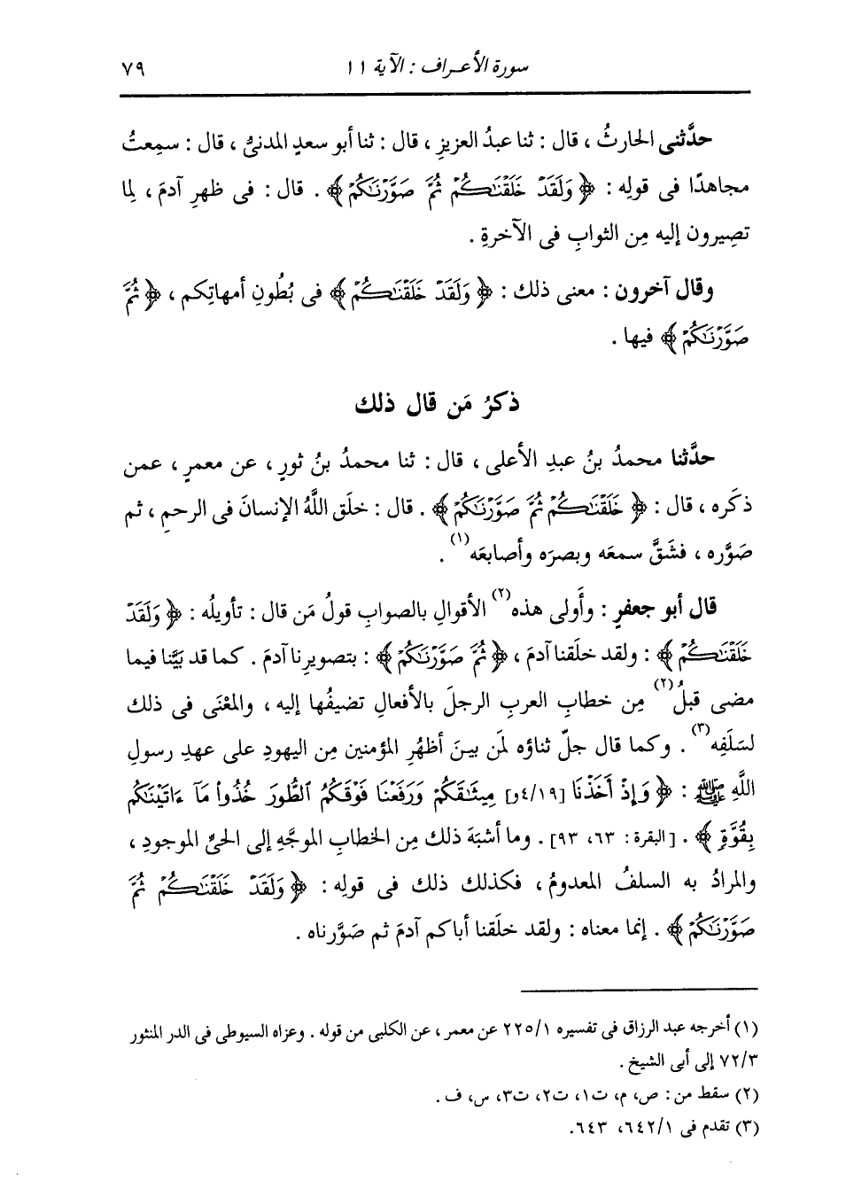 حَدَّثَنِي الْحَرْثُ قَالَ: ثنا عَبْدُ الْعَزِيزِ قَالَ: ثنا أَبُو سَعْدٍ الْمَدَنِيُّ قَالَ: سَمِعْتُ مُجَاهِدًا فِي قَوْلِهِ: {§وَلَقَدْ خَلَقْنَاكُمْ ثُمَّ صَوَّرْنَاكُمْ} [الأعراف: 11] قَالَ: «فِي ظَهْرِ آدَمَ لِمَا تَصِيرُونَ إِلَيْهِ مِنَ الثَّوَابِ فِي الْآخِرَةِ» وَقَالَ آخَرُونَ: مَعْنَى ذَلِكَ: وَلَقَدْ خَلَقْنَاكُمْ فِي بُطُونِ أُمَّهَاتِكُمْ، ثُمَّ صَوَّرْنَاكُمْ فِيهَا