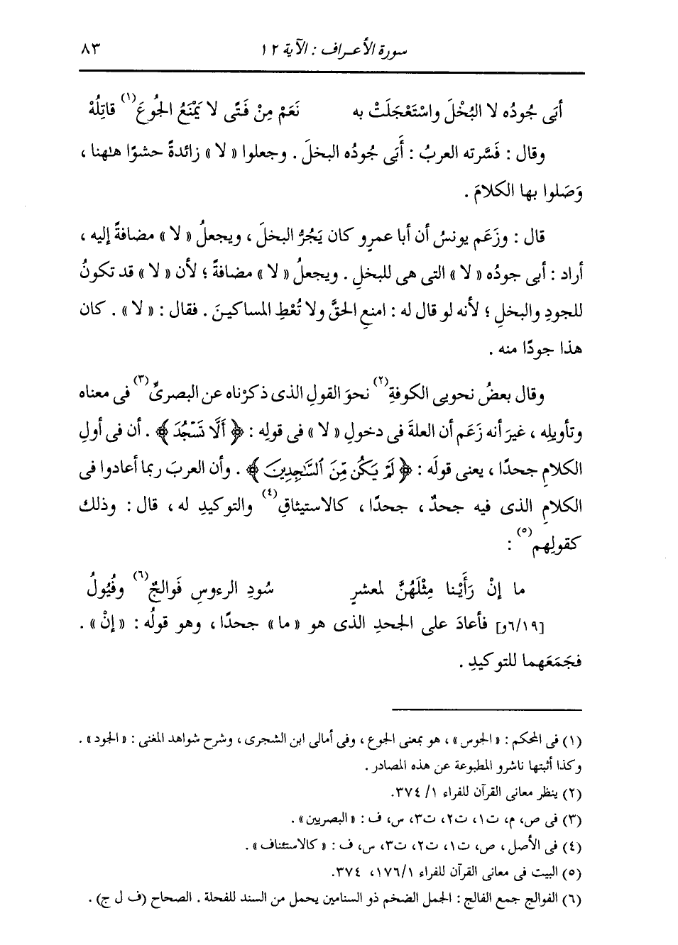 وَقَالَ: فَسَّرَتْهُ الْعَرَبُ: أَبَى جُودُهُ الْبُخْلَ، وَجَعَلُوا (لَا) زَائِدَةً حَشْوًا هَهُنَا وَصَلُوا بِهَا الْكَلَامَ. قَالَ: وَزَعَمَ يُونُسُ أَنَّ أَبَا عَمْرٍو كَانَ يَجُرُّ (الْبُخْلَ) ، وَيَجْعَلُ (لَا) مُضَافَةً إِلَيْهِ، أَرَادَ: أَبَى جُودُهُ (لَا) الَّتِي هِيَ لِلْبُخْلِ، وَيَجْعَلُ (لَا) مُضَافَةً، لِأَنَّ (لَا) قَدْ تَكُونُ لِلْجُودِ وَالْبُخْلِ، لِأَنَّهُ لَوْ قَالَ لَهُ: امْنَعِ الْحَقَّ وَلَا تُعْطِ الْمِسْكِينَ، فَقَالَ (لَا) كَانَ هَذَا جُودًا مِنْهُ. وَقَالَ بَعْضُ نَحْوِيِّي الْكُوفَةِ نَحْوَ الْقَوْلِ الَّذِي ذَكَرْنَاهُ عَنِ الْبَصْرِيِّينَ فِي مَعْنَاهُ وَتَأْوِيلِهِ، غَيْرَ أَنَّهُ زَعَمَ أَنَّ الْعِلَّةَ فِي دُخُولِ (لَا) فِي قَوْلِهِ: {أَلَّا تَسْجُدَ} [الأعراف: 12] ، أَنَّ فِيَ أَوَّلِ الْكَلَامِ جَحْدًا، يَعْنِي بِذَلِكَ قَوْلَهُ: {لَمْ يَكُنْ مِنَ السَّاجِدِينَ} [الأعراف: 11] ، فَإِنَّ الْعَرَبَ رُبَّمَا أَعَادُوا فِي الْكَلَامِ الَّذِي فِيهِ جَحْدُ الْجَحْدِ، كَالِاسْتِيثَاقِ وَالتَّوْكِيدِ لَهُ، قَالَ: وَذَلِكَ كَقَوْلِهِمْ: