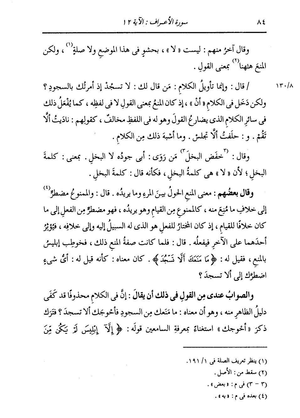 وَقَالَ آخَرُ مِنْهُمْ: لَيْسَتْ (لَا) بِحَشْو فِي هَذَا الْمَوْضِعِ، وَلَا صِلَةٍ، وَلَكِنَّ الْمَنْعَ هَهُنَا بِمَعْنَى الْقَوْلِ. إِنَّمَا تَأْوِيلُ الْكَلَامِ: مَنْ قَالَ لَكَ لَا تَسْجُدْ إِذْ أَمَرْتُكَ بِالسُّجُودِ؟ وَلَكِنْ دَخَلَ فِي الْكَلَامِ (أَنْ) إِذْ كَانَ الْمَنْعُ بِمَعْنَى الْقَوْلِ لَا فِي لَفْظِهِ، كَمَا يُفْعَلُ ذَلِكَ فِي سَائِرِ الْكَلَامِ الَّذِي يُضَارِعُ الْقَوْلَ، وَهُوَ لَهُ فِي اللَّفْظِ مُخَالِفٌ كَقَوْلِهِمْ: نَادَيْتُ أَنْ لَا تَقُمْ، وَحَلَفْتُ أَنْ لَا تَجْلِسَ، وَمَا أَشْبَهَ ذَلِكَ مِنَ الْكَلَامِ. وَقَالَ بَعْضُ مَنْ رَوَى: (أَبَى جُودُهُ لَا الْبُخْلِ) بِمَعْنَى: كَلِمَةِ الْبُخْلِ، لِأَنَّ (لَا) هِيَ كَلِمَةُ الْبُخْلِ، فَكَأَنَّهُ قَالَ: كَلِمَةَ الْبُخْلِ. وَقَالَ بَعْضُهُمْ: مَعْنَى الْمَنْعِ: الْحَوْلُ بَيْنَ الْمَرْءِ وَمَا يُرِيدُهُ، قَالَ: وَالْمَمْنُوعُ مُضْطَرٌّ بِهِ إِلَى خِلَافِ مَا مُنِعَ مِنْهُ، كَالْمَمْنُوعِ مِنَ الْقِيَامِ وَهُوَ يُرِيدُهُ، فَهُوَ مُضْطَرٌّ مِنَ الْفِعْلِ إِلَى مَا كَانَ خِلَافًا لِلْقِيَامِ، إِذْ كَانَ الْمُخْتَارُ لِلْفِعْلِ هُوَ الَّذِي لَهُ السَّبِيلُ إِلَيْهِ وَإِلَى خِلَافِهِ، فَيُؤْثِرُ أَحَدَهُمَا عَلَى الْآخَرِ فَيَفْعَلُهُ، قَالَ: فَلَمَّا كَانَتْ صِفَةُ الْمَنْعِ ذَلِكَ، فَخُوطِبَ إِبْلِيسُ بِالْمَنْعِ، فَقِيلَ لَهُ: {مَا مَنَعَكَ أَلَّا تَسْجُدَ} [الأعراف: 12] كَانَ مَعْنَاهُ: كَأَنَّهُ قِيلَ لَهُ: أَيُّ شَيْءٍ اضْطَرَّكَ إِلَى أَنْ لَا تَسْجُدَ. قَالَ أَبُو جَعْفَرٍ: وَالصَّوَابُ عِنْدِي مِنَ الْقَوْلِ فِي ذَلِكَ أَنْ يُقَالَ: إِنَّ فِي الْكَلَامِ مَحْذُوفًا قَدْ كَفَى دَلِيلُ الظَّاهِرِ مِنْهُ، وَهُوَ أَنَّ مَعْنَاهُ: مَا مَنَعَكَ مِنَ السُّجُودِ فَأَحْوَجَكَ أَنْ لَا تَسْجُدَ؟ فَتَرَكَ ذِكْرَ أَحْوَجَكَ اسْتِغْنَاءً بِمَعْرِفَةِ السَّامِعِينَ. قَوْلُهُ: {إِلَّا إِبْلِيسَ لَمْ يَكُنْ مِنَ