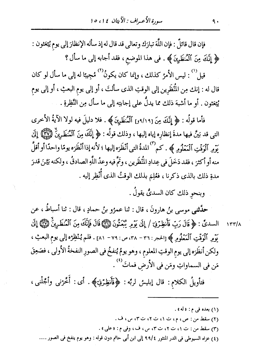 §وَأَمَّا قَوْلُهُ: {إِنَّكَ مِنَ الْمُنْظَرِينَ} [الأعراف: 15] فَلَا دَلِيلَ فِيهِ لَوْلَا الْآيَةُ الْأُخْرَى الَّتِي قَدْ بَيَّنَ فِيهَا مُدَّةَ إِنْظَارِهِ إِيَّاهُ إِلَيْهَا، وَذَلِكَ قَوْلُهُ: {فَإِنَّكَ مِنَ الْمُنْظَرِينَ إِلَى يَوْمِ الْوَقْتِ الْمَعْلُومِ} [الحجر: 38] عَلَى الْمُدَّةِ الَّتِي أَنْظَرَهُ إِلَيْهَا، لِأَنَّهُ إِذَا أَنْظَرَهُ يَوْمًا وَاحِدًا أَوْ أَقَلَّ مِنْهُ أَوْ أَكْثَرَ، فَقَدْ دَخَلَ فِي عِدَادِ الْمُنْظَرِينَ وَتَمَّ فِيهِ وَعْدُ اللَّهِ الصَّادِقُ، وَلَكِنَّهُ قَدْ بَيَّنَ قَدْرَ مُدَّةِ ذَلِكَ بِالَّذِي ذَكَرْنَاهُ، فَعَلِمَ بِذَلِكَ الْوَقْتَ الَّذِي أُنْظِرَ إِلَيْهِ. وَبِنَحْوِ ذَلِكَ كَانَ السُّدِّيُّ يَقُولُ