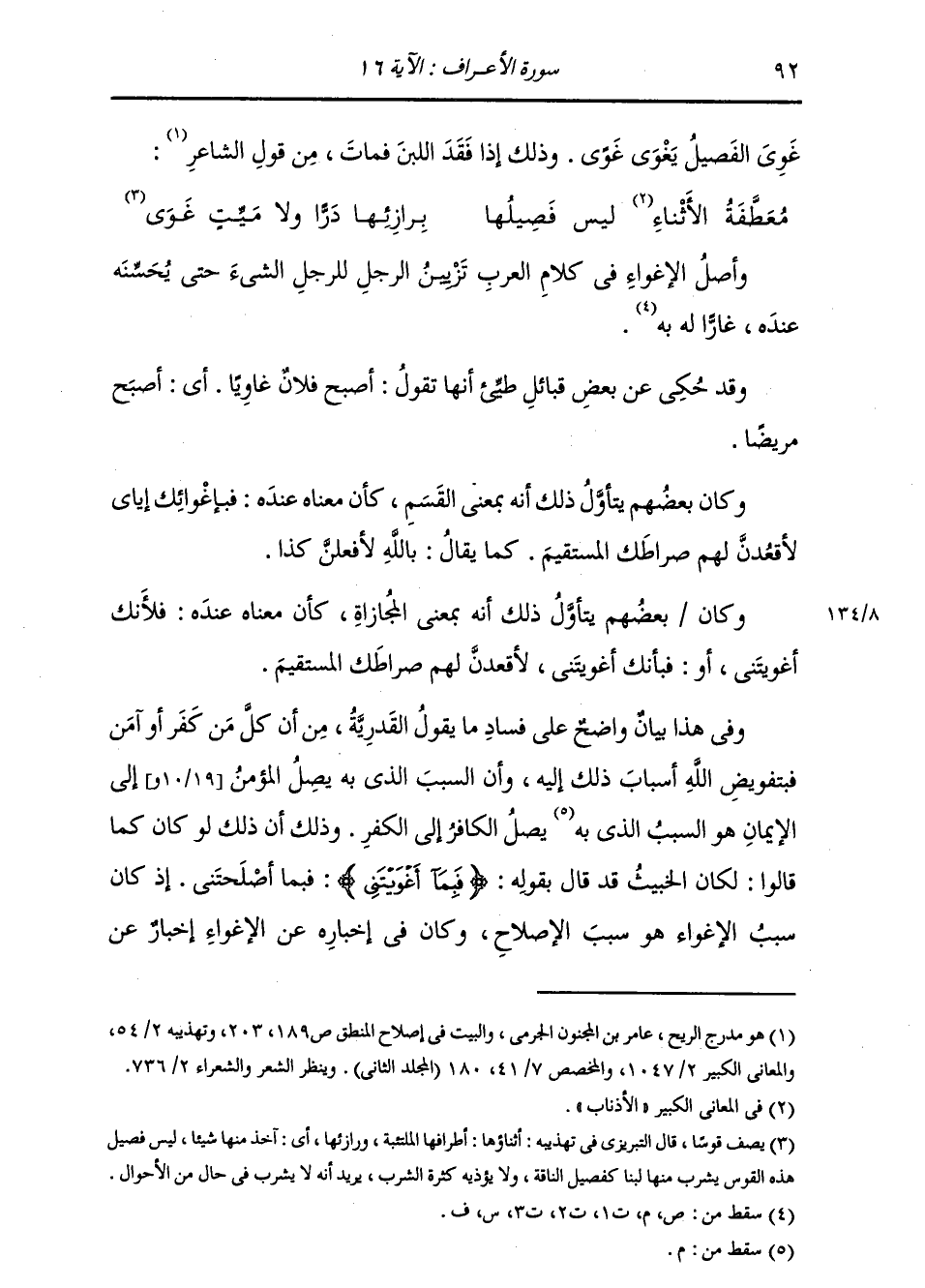 وَأَصْلُ الْإِغْوَاءِ فِي كَلَامِ الْعَرَبِ: تَزْيِينُ الرَّجُلِ لِلرَّجُلِ الشَّيْءَ حَتَّى يُحَسِّنَهُ عِنْدَهُ غَارًّا لَهُ. وَقَدْ حُكِيَ عَنْ بَعْضِ قَبَائِلِ طَيِّئٍ أَنَّهَا تَقُولُ: أَصْبَحَ فُلَانٌ غَاوِيًا: أَيْ أَصْبَحَ مَرِيضًا. وَكَانَ بَعْضُهُمْ يَتَأَوَّلُ ذَلِكَ أَنَّهُ بِمَعْنَى الْقَسَمِ، كَأَنَّ مَعْنَاهُ عِنْدَهُ: فَبِإِغْوَائِكَ إِيَّايَ لَأَقْعُدَنَّ لَهُمْ صِرَاطَكَ الْمُسْتَقِيمَ، كَمَا يُقَالُ: بِاللَّهِ لَأَفْعَلَنَّ كَذَا. وَكَانَ بَعْضُهُمْ يَتَأَوَّلُ ذَلِكَ بِمَعْنَى الْمُجَازَاةِ، كَأَنَّ مَعْنَاهُ عِنْدَهُ: فَلِأَنَّكَ أَغْوَيْتَنِي، أَوْ فَبِأَنَّكَ أَغْوَيْتَنِي لَأَقْعُدَنَّ لَهُمْ صِرَاطَكَ الْمُسْتَقِيمَ. وَفِي هَذَا بَيَانٌ وَاضِحٌ عَلَى فَسَادِ مَا يَقُولُ الْقَدَرِيَّةُ مِنْ أَنَّ كُلَّ مَنْ كَفَرَ أَوْ آمَنَ فَبِتَفْوِيضِ اللَّهِ أَسْبَابَ ذَلِكَ إِلَيْهِ، وَأَنَّ السَّبَبَ الَّذِي بِهِ يَصِلُ الْمُؤْمِنُ إِلَى الْإِيمَانِ هُوَ السَّبَبُ الَّذِي بِهِ يَصِلُ الْكَافِرُ إِلَى الْكُفْرِ، وَذَلِكَ أَنَّ ذَلِكَ لَوْ كَانَ كَمَا قَالُوا لَكَانَ الْخَبِيثُ قَدْ قَالَ بِقَوْلِهِ: {فَبِمَا أَغْوَيْتَنِي} [الأعراف: 16] فَبِمَا أَصْلَحْتَنِي، إِذْ كَانَ سَبَبُ الْإِغْوَاءِ هُوَ سَبَبَ الْإِصْلَاحِ، وَكَانَ فِي إِخْبَارِهِ عَنِ الْإِغْوَاءِ إِخْبَارٌ عَنِ