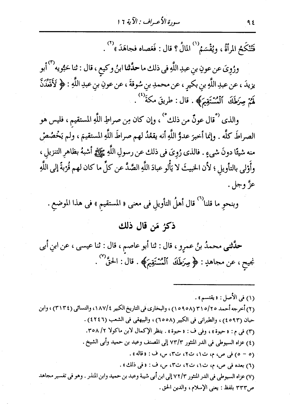 مَا حَدَّثَنَا ابْنُ وَكِيعٍ، قَالَ: ثنا حَيْوَةُ أَبُو يَزِيدَ، عَنْ عَبْدِ اللَّهِ بْنِ بُكَيْرٍ، عَنْ مُحَمَّدِ بْنِ سُوقَةَ، عَنْ عَوْنِ بْنِ عَبْدِ اللَّهِ: {§لَأَقْعُدَنَّ لَهُمْ صِرَاطَكَ الْمُسْتَقِيمَ} [الأعراف: 16] قَالَ: «طَرِيقَ مَكَّةَ» وَالَّذِي قَالَهُ عَوْنٌ وَإِنْ كَانَ مِنْ صِرَاطِ اللَّهِ الْمُسْتَقِيمِ فَلَيْسَ هُوَ الصِّرَاطَ كُلَّهُ، وَإِنَّمَا أَخْبَرَ عَدُوُّ اللَّهِ أَنَّهُ يَقْعُدُ لَهُمْ صِرَاطَ اللَّهِ الْمُسْتَقِيمَ وَلَمْ يُخَصِّصْ مِنْهُ شَيْئًا دُونَ شَيْءٍ، فَالَّذِي رُوِيَ فِي ذَلِكَ عَنْ رَسُولِ اللَّهِ صَلَّى اللهُ عَلَيْهِ وَسَلَّمَ أَشْبَهُ بِظَاهِرِ التَّنْزِيلِ وَأَوْلَى بِالتَّأْوِيلِ، لِأَنَّ الْخَبِيثَ لَا يَأْلُو عِبَادَ اللَّهِ الصَّدَّ عَنْ كُلِّ مَا كَانَ لَهُمْ قُرْبَةً إِلَى اللَّهِ. وَبِنَحْوِ مَا قُلْنَا فِي ذَلِكَ قَالَ أَهْلُ التَّأْوِيلِ فِي مَعْنَى الْمُسْتَقِيمِ فِي هَذَا الْمَوْضِعِ