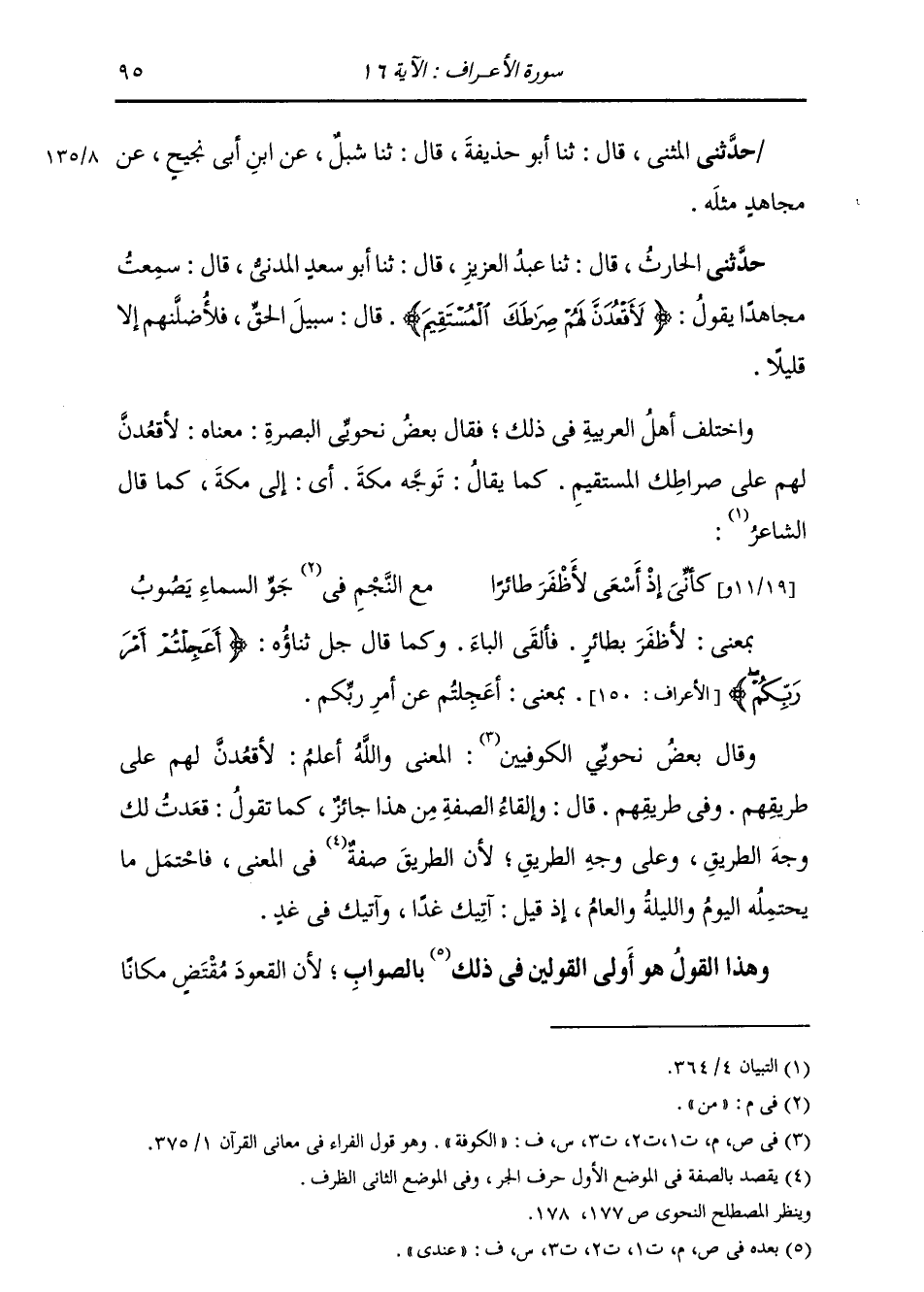 حَدَّثَنِي الْحَرْثُ، قَالَ: ثنا عَبْدُ الْعَزِيزِ، قَالَ: ثنا أَبُو سَعْدٍ الْمَدَنِيُّ، قَالَ: سَمِعْتُ مُجَاهِدًا، يَقُولُ: {لَأَقْعُدَنَّ لَهُمْ صِرَاطَكَ الْمُسْتَقِيمَ} [الأعراف: 16] قَالَ: «§سَبِيلَ الْحَقِّ، فَلَأُضِلَّنَّهُمْ إِلَّا قَلِيلًا» وَاخْتَلَفَ أَهْلُ الْعَرَبِيَّةِ فِي ذَلِكَ، فَقَالَ بَعْضُ نَحْوِيِّي الْبَصْرَةِ: مَعْنَاهُ: لَأَقْعُدَنَّ لَهُمْ عَلَى صِرَاطِكَ الْمُسْتَقِيمِ، كَمَا يُقَالُ: تَوَجَّهَ مَكَّةَ: أَيْ إِلَى مَكَّةَ، وَكَمَا قَالَ الشَّاعِرُ: