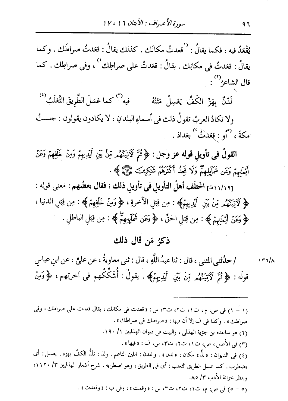 ذِكْرُ مَنْ قَالَ ذَلِكَ حَدَّثَنِي الْمُثَنَّى، قَالَ: ثنا عَبْدُ اللَّهِ بْنُ صَالِحٍ، قَالَ: ثني مُعَاوِيَةُ، عَنْ عَلِيٍّ، عَنِ ابْنِ عَبَّاسٍ، قَوْلُهُ: {§ثُمَّ لَآتِيَنَّهُمْ مِنْ بَيْنِ أَيْدِيهِمْ} [الأعراف: 17] يَقُولُ: «أُشَكِّكُهُمْ فِي آخِرَتِهِمْ» ، {وَمِنْ -[97]- خَلْفِهِمْ} [الأعراف: 17] «أُرَغِّبُهُمْ فِي دُنْيَاهُمْ» ، {وَعَنْ أَيْمَانِهِمْ} [الأعراف: 17] " أُشَبِّهُ عَلَيْهِمْ أَمْرَ دِينِهِمْ، {وَعَنْ شَمَائِلِهِمْ} [الأعراف: 17] «أُشَهِّي لَهُمُ الْمَعَاصِيَ» وَقَدْ رُوِيَ عَنِ ابْنِ عَبَّاسٍ بِهَذَا الْإِسْنَادِ فِي تَأْوِيلِ ذَلِكَ خِلَافُ هَذَا التَّأْوِيلِ