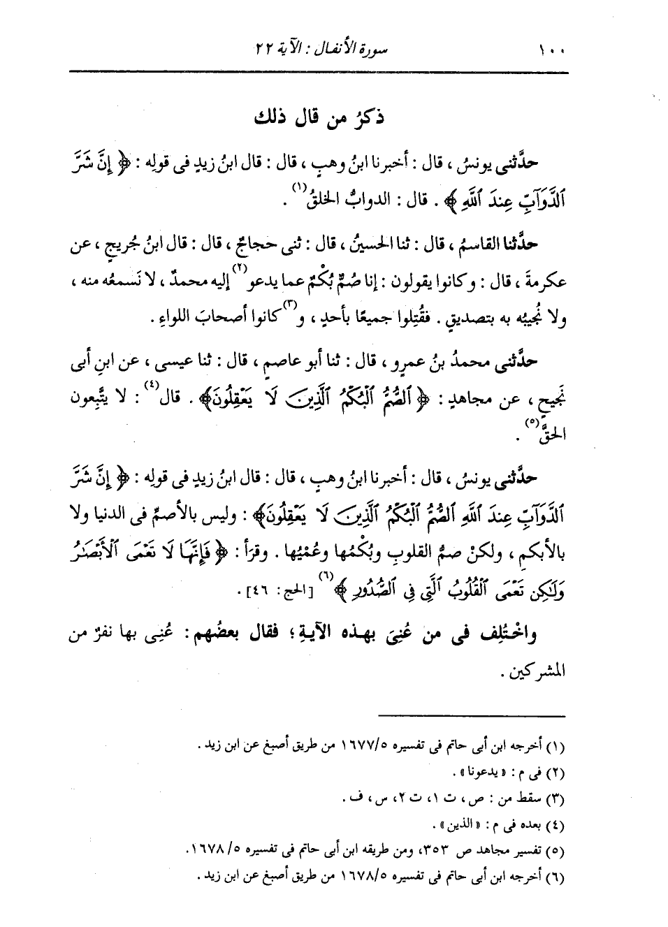 حَدَّثَنِي يُونُسُ، قَالَ: أَخْبَرَنَا ابْنُ وَهْبٍ، قَالَ: قَالَ ابْنُ زَيْدٍ، فِي قَوْلِهِ: " {§إِنَّ شَرَّ الدَّوَابِّ عِنْدَ اللَّهِ الصُّمُّ الْبُكْمُ الَّذِينَ لَا يَعْقِلُونَ} [الأنفال: 22] وَلَيْسَ بِالْأَصَمِّ فِي الدُّنْيَا وَلَا بِالْأَبْكَمِ، وَلَكِنْ صُمُّ الْقُلُوبِ وَبُكْمُهَا وَعُمْيُهَا. وَقَرَأَ: {فَإِنَّهَا لَا تَعْمَى الْأَبْصَارُ وَلَكِنْ تَعْمَى الْقُلُوبُ الَّتِي فِي الصُّدُورِ} [الحج: 46] " وَاخْتُلِفَ فِيمَنْ عنيَ بِهَذِهِ الْآيَةِ، فَقَالَ بَعْضُهُمْ: عنيَ بِهَا نَفَرٌ مِنَ الْمُشْرِكِينَ