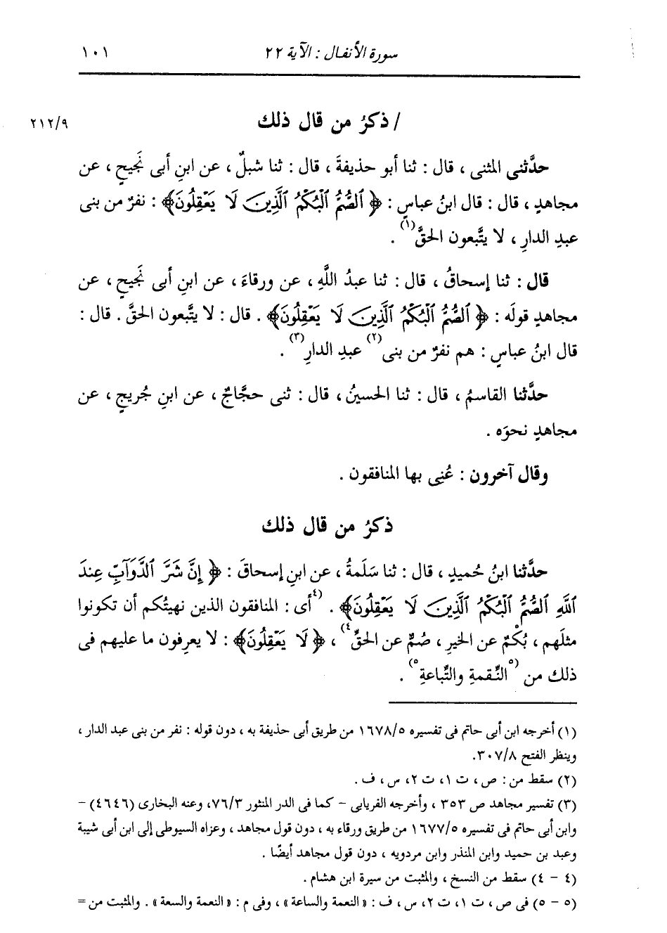 قَالَ: ثنا إِسْحَاقُ قَالَ: ثنا عَبْدُ اللَّهِ، عَنْ وَرْقَاءَ، عَنِ ابْنِ أَبِي نَجِيحٍ، عَنْ مُجَاهِدٍ، قَوْلُهُ: {الصُّمُّ الْبُكْمُ الَّذِينَ لَا يَعْقِلُونَ} [الأنفال: 22] قَالَ: لَا يَتَّبِعُونَ الْحَقَّ. قَالَ: قَالَ ابْنُ عَبَّاسٍ: «§هُمْ نَفَرٌ مِنْ بَنِي عَبْدِ الدَّارِ» حَدَّثَنَا الْقَاسِمُ قَالَ: ثنا الْحُسَيْنُ قَالَ: ثني حَجَّاجٌ، عَنِ ابْنِ جُرَيْجٍ، عَنْ مُجَاهِدٍ، نَحْوَهُ. وَقَالَ آخَرُونَ: عنيَ بِهَا الْمُنَافِقُونَ