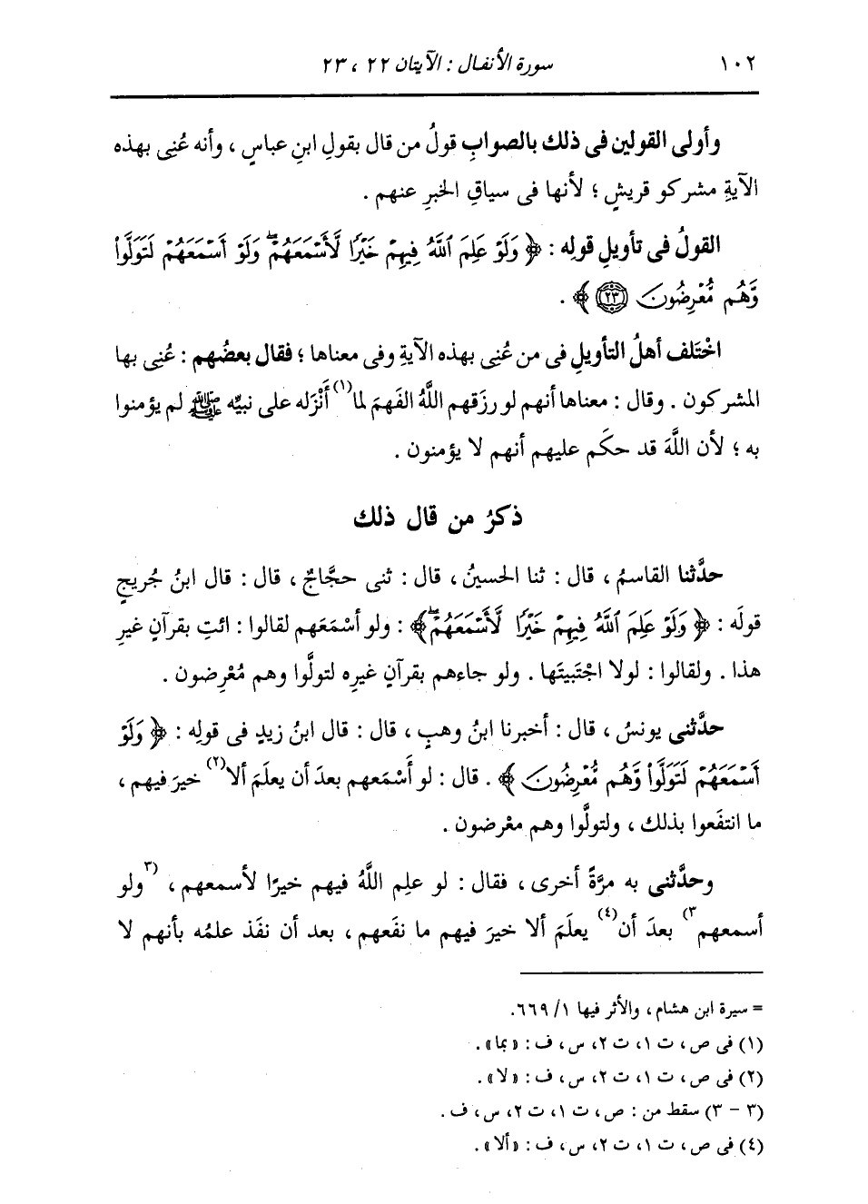 §الْقَوْلُ فِي تَأْوِيلِ قَوْلِهِ تَعَالَى: {وَلَوْ عَلِمَ اللَّهُ فِيهِمْ خَيْرًا لَأَسْمَعَهُمْ وَلَوْ أَسْمَعَهُمْ لَتَوَلَّوْا وَهُمْ مُعْرِضُونَ} [الأنفال: 23] اخْتَلَفَ أَهْلُ التَّأْوِيلِ، فِيمَنْ عنيَ بِهَذِهِ الْآيَةِ وَفِي مَعْنَاهَا، فَقَالَ بَعْضُهُمْ: عنيَ بِهَا الْمُشْرِكُونَ، وَقَالَ: مَعْنَاهُ أَنَّهُمْ لَوْ رَزَقَهُمُ اللَّهُ الْفَهْمَ لِمَا أَنْزَلَهُ عَلَى نَبِيِّهِ صَلَّى اللهُ عَلَيْهِ وَسَلَّمَ لَمْ يُؤْمِنُوا بِهِ؛ لِأَنَّ اللَّهَ قَدْ حَكَمَ عَلَيْهِمْ أَنَّهُمْ لَا يُؤْمِنُونَ