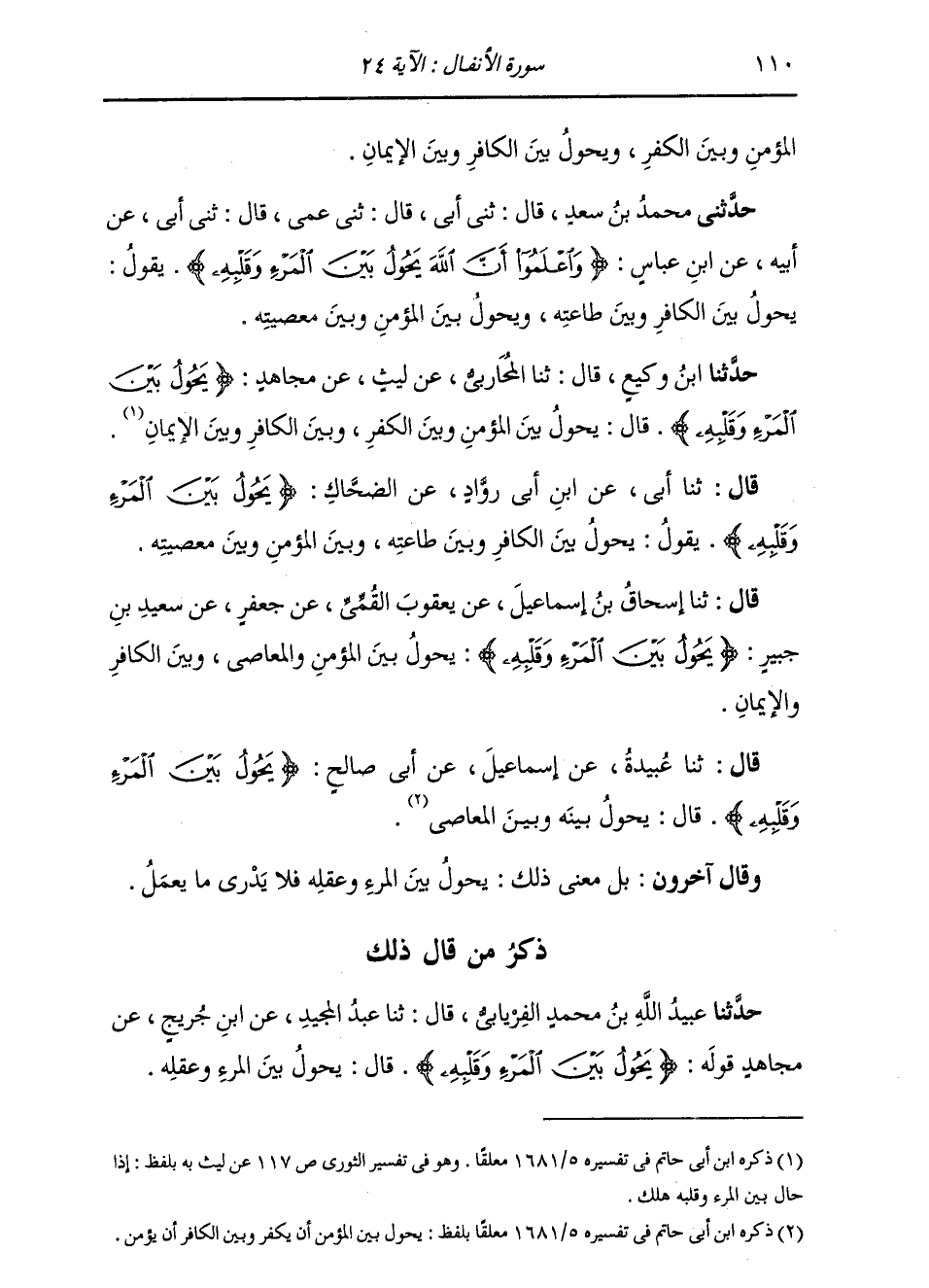 قَالَ: ثنا إِسْحَاقُ بْنُ إِسْمَاعِيلَ، عَنْ يَعْقُوبَ الْقُمِّيِّ، عَنْ جَعْفَرٍ، عَنْ سَعِيدِ بْنِ جُبَيْرٍ: " {§يَحُولُ بَيْنَ الْمَرْءِ وَقَلْبِهِ} [الأنفال: 24] يَحُولُ بَيْنَ الْمُؤْمِنِ وَالْمَعَاصِي، وَبَيْنَ الْكَافِرِ وَالْإِيمَانِ "