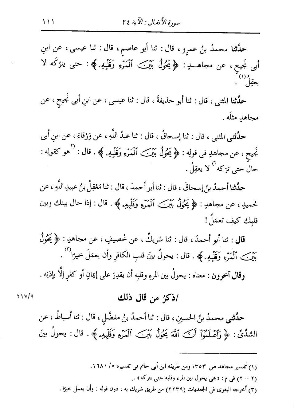 حَدَّثَنِي الْمُثَنَّى قَالَ: ثنا إِسْحَاقُ قَالَ: ثنا عَبْدُ اللَّهِ، عَنْ وَرْقَاءَ، عَنِ ابْنِ أَبِي نَجِيحٍ، عَنْ مُجَاهِدٍ، فِي قَوْلِهِ: " {§يَحُولُ بَيْنَ الْمَرْءِ وَقَلْبِهِ} [الأنفال: 24] قَالَ: هِيَ يَحُولُ بَيْنَ الْمَرْءِ وَقَلْبِهِ حَتَّى يَتْرُكَهُ لَا يَعْقِلُ "