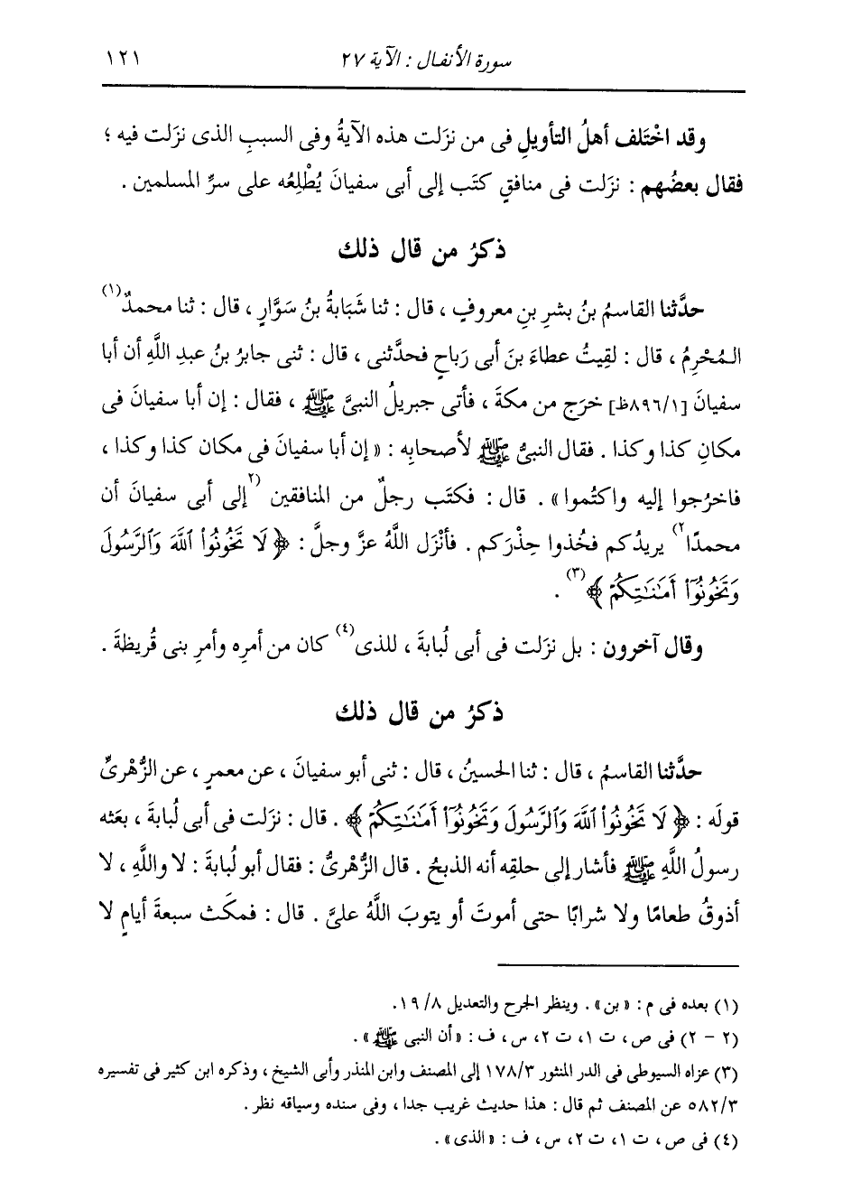 ذِكْرُ مَنْ قَالَ ذَلِكَ: حَدَّثَنَا الْقَاسِمُ بْنُ بِشْرِ بْنِ مَعْرُوفٍ، قَالَ: ثنا شَبَابَةُ بْنُ سَوَّارٍ، قَالَ: ثنا مُحَمَّدُ بْنُ الْمُحْرِمِ، قَالَ: لَقِيتُ عَطَاءَ بْنَ أَبِي رَبَاحٍ فَحدثني قَالَ: ثني جَابِرُ بْنُ عَبْدِ اللَّهِ: أَنَّ أَبَا سُفْيَانَ خَرَجَ مِنْ مَكَّةَ، فَأَتَى جِبْرِيلُ النَّبِيَّ صَلَّى اللهُ عَلَيْهِ وَسَلَّمَ فَقَالَ: إِنَّ أَبَا سُفْيَانَ فِي مَكَانِ كَذَا وَكَذَا. فَقَالَ النَّبِيُّ صَلَّى اللهُ عَلَيْهِ وَسَلَّمَ لِأَصْحَابِهِ: «إِنَّ §أَبَا سُفْيَانَ فِي مَكَانِ كَذَا وَكَذَا فَاخْرُجُوا إِلَيْهِ وَاكْتُمُوا» قَالَ: فَكَتَبَ رَجُلٌ مِنَ الْمُنَافِقِينَ إِلَى أَبِي سُفْيَانَ: إِنَّ مُحَمَّدًا يُرِيدُكُمْ، فَخُذُوا حِذْرَكُمْ، فَأَنْزَلَ اللَّهُ عَزَّ وَجَلَّ: {لَا تَخُونُوا اللَّهَ وَالرَّسُولَ وَتَخُونُوا أَمَانَاتِكُمْ} [الأنفال: 27] " وَقَالَ آخَرُونَ: بَلْ نَزَلَتْ فِي أَبِي لُبَابَةَ لِلَّذِي كَانَ مِنْ أَمْرِهِ وَأَمْرِ بَنِي قُرَيْظَةَ